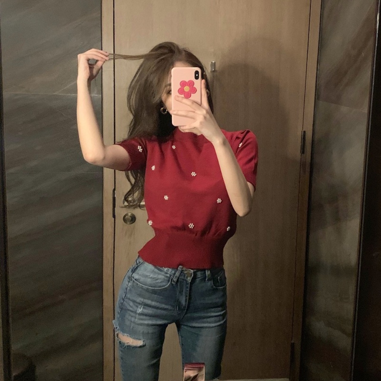 花模様のビジューが可愛いトップス。