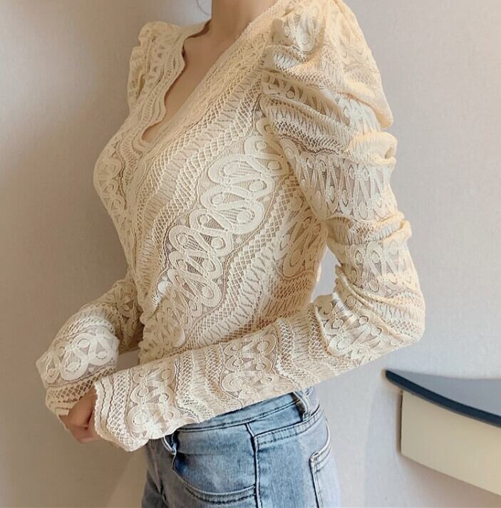 シャツ プルオーバー トップス レース レディース 透け感 Vネック フリル セクシー 華やか 長袖 アプリコット ab1827