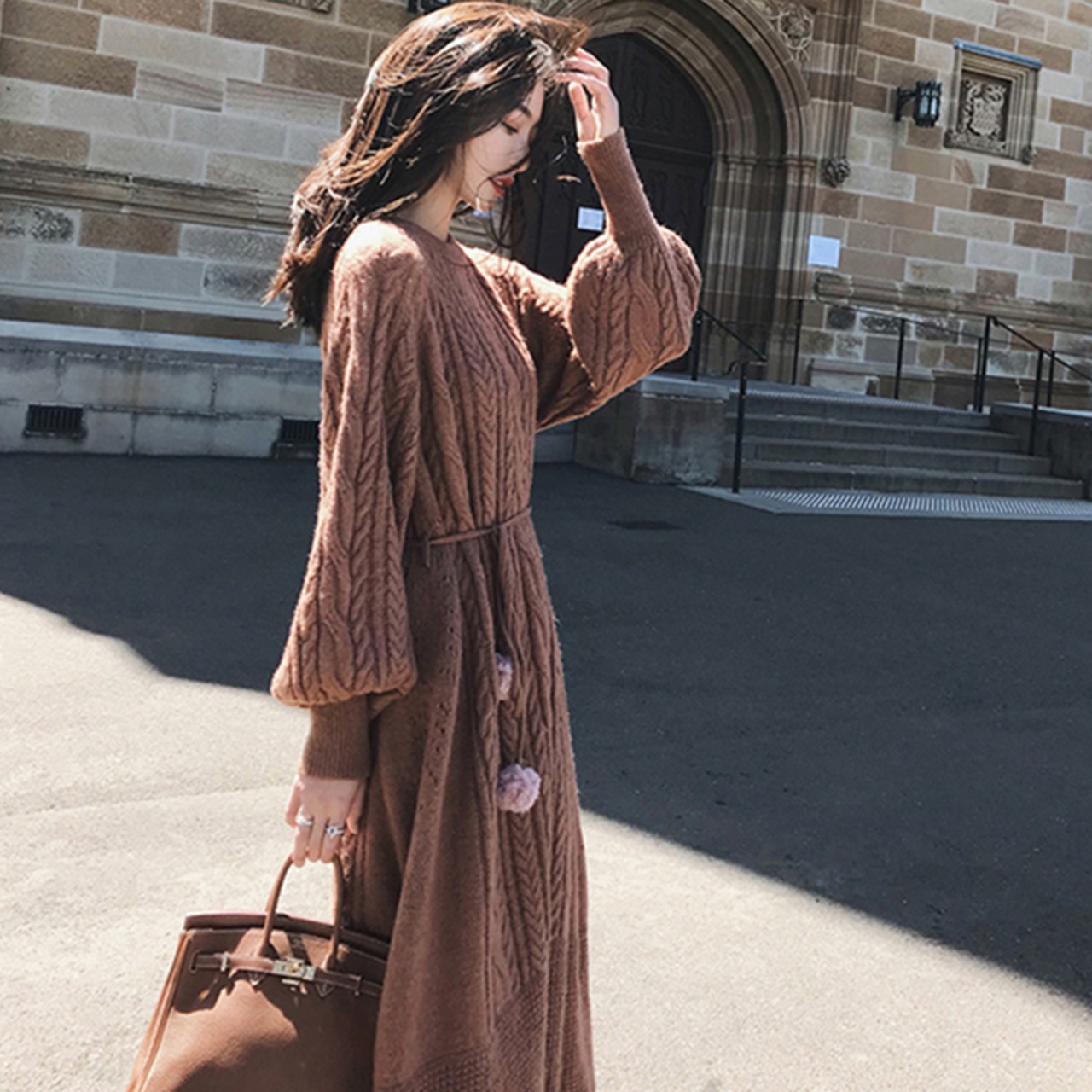 ワンピース ニット セーター ロング丈 ランタンスリーブ ウエストマーク 大人可愛い ママコーデ デート お出かけ MH2420