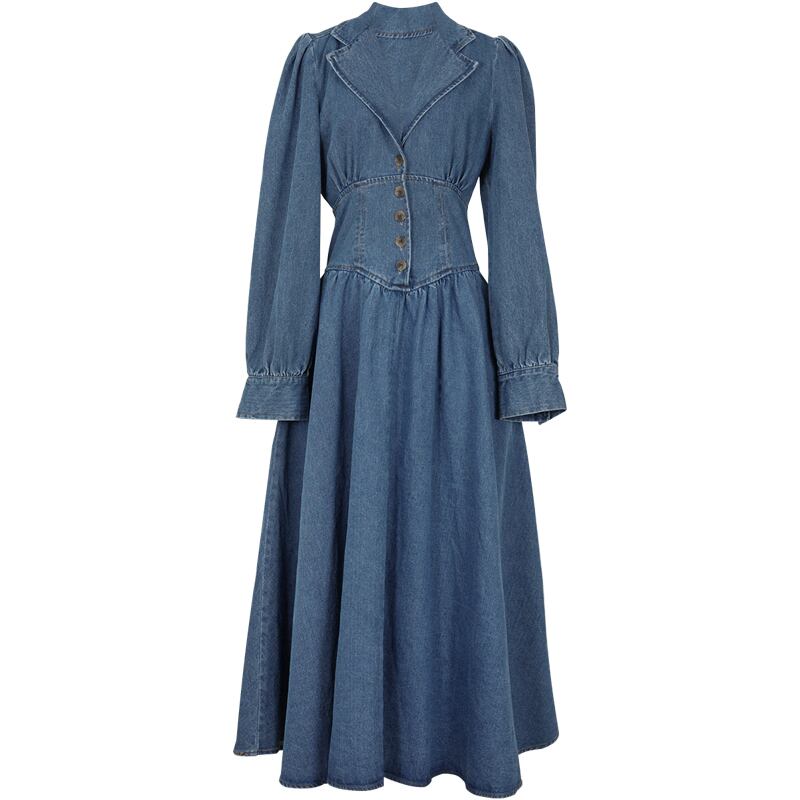 ワンピース ロング丈 デニム オープンカラー Aライン 長袖 きれいめ 大人可愛い カジュアル ママコーデ デート お出かけ MH2431