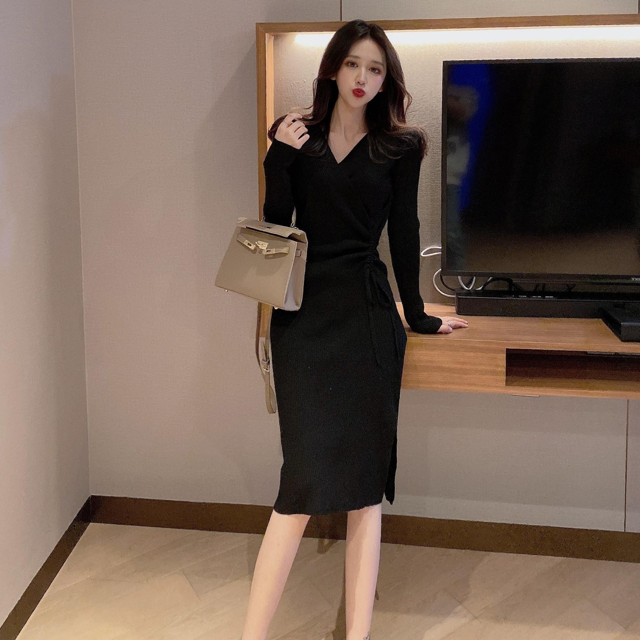 ワンピース ニットワンピース カシュクールワンピ 長袖 膝丈 シャーリング きれいめ 通勤 OL デート お出かけ MH2436