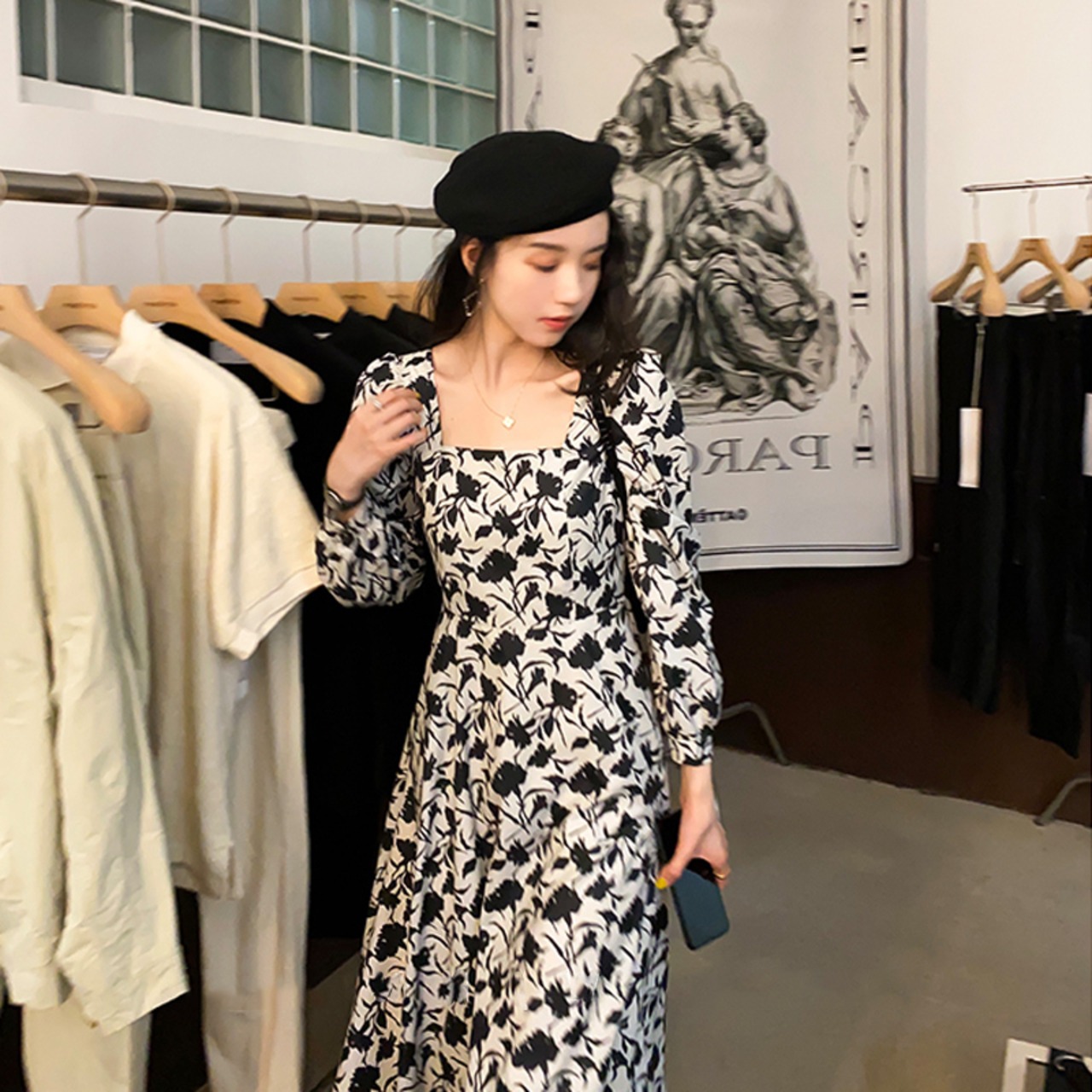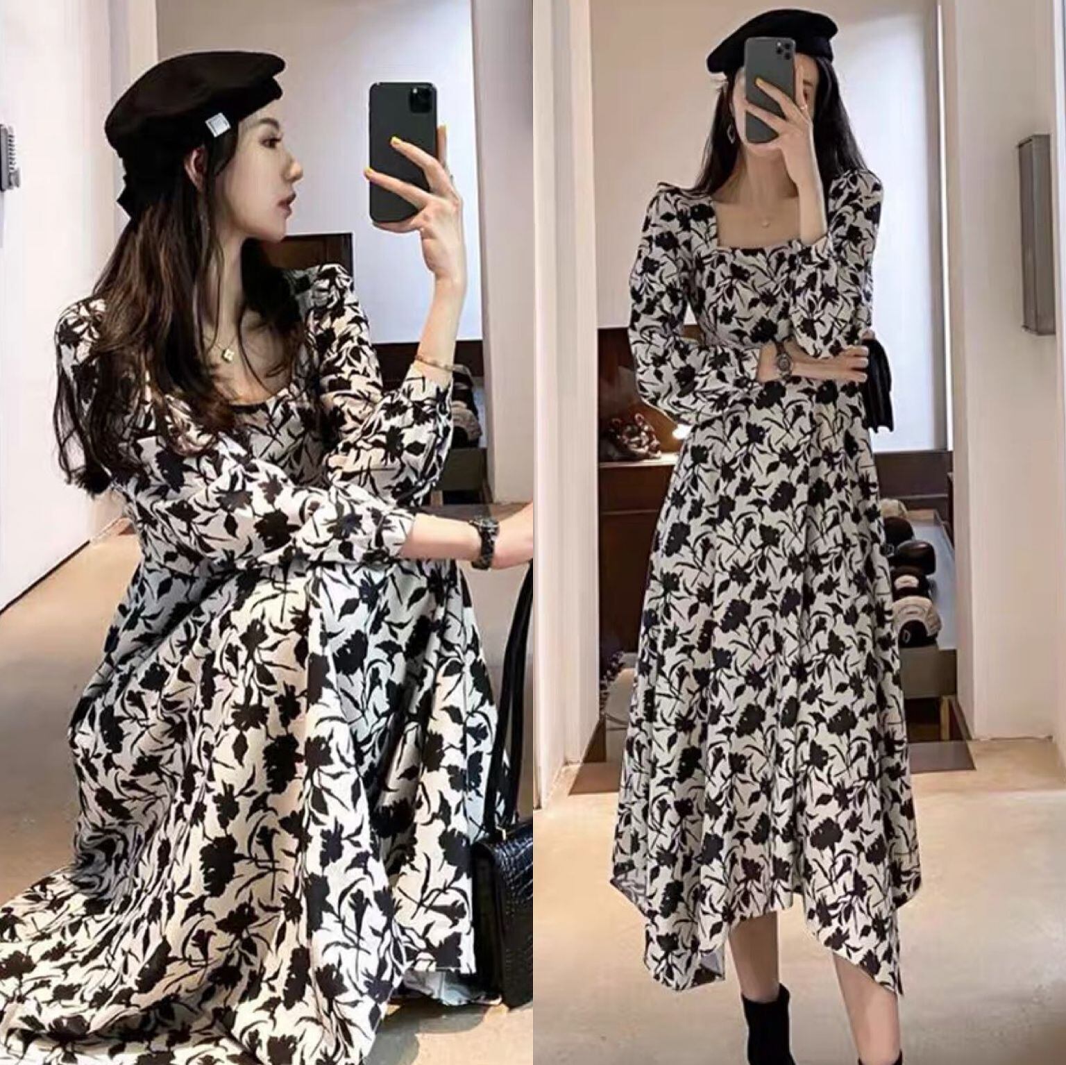 ワンピース 花柄 スクエアカラー 長袖 ミディ丈 大人可愛い シフォン ママコーデ お出かけ デート 秋冬 MH2475