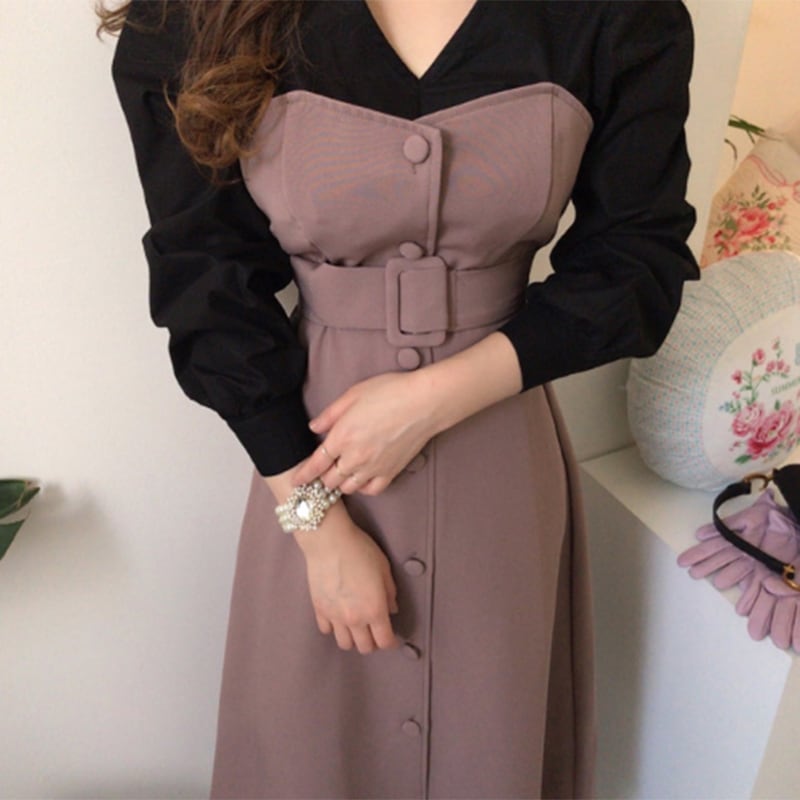 ドッキングワンピース ワンピース 重ね着風 ビスチェ風 ウエストマーク 大人可愛い ママコーデ 通勤 デート お出かけ MH2490