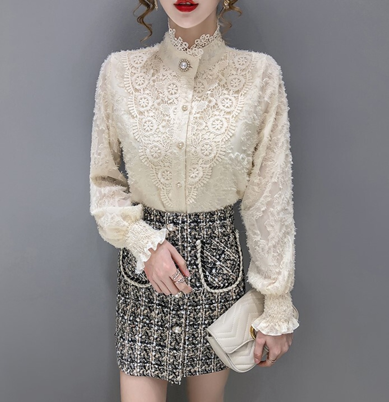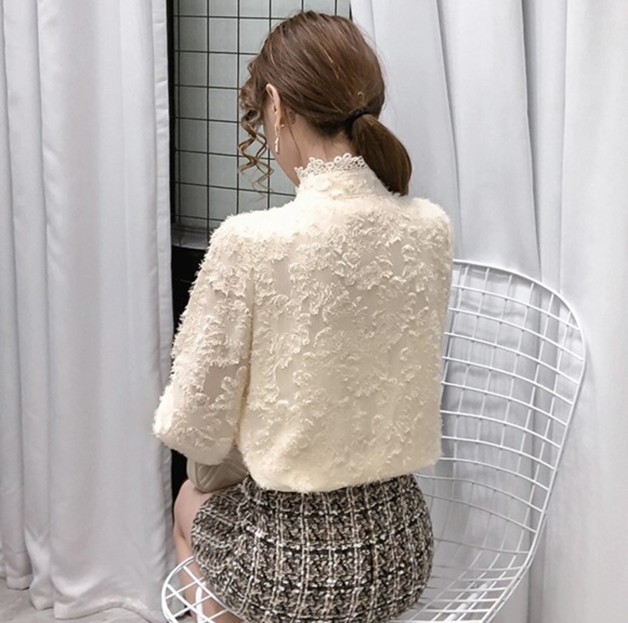 ブラウス シャツ レディース 秋冬 長袖 フリル レース ハイネック エレガント ゴージャス プチプラ ab1854