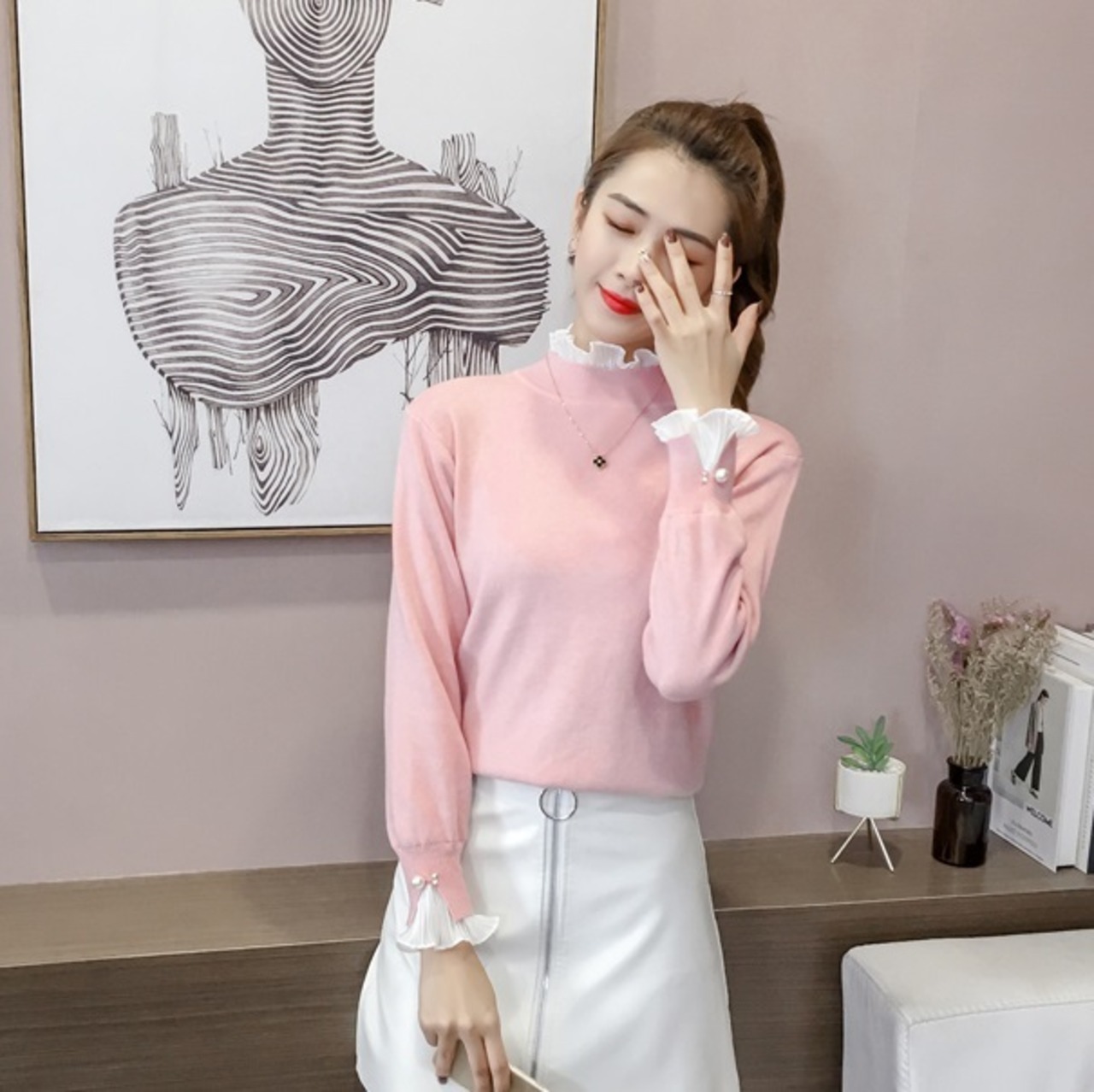 ニットとフリルがかわいいトップス。