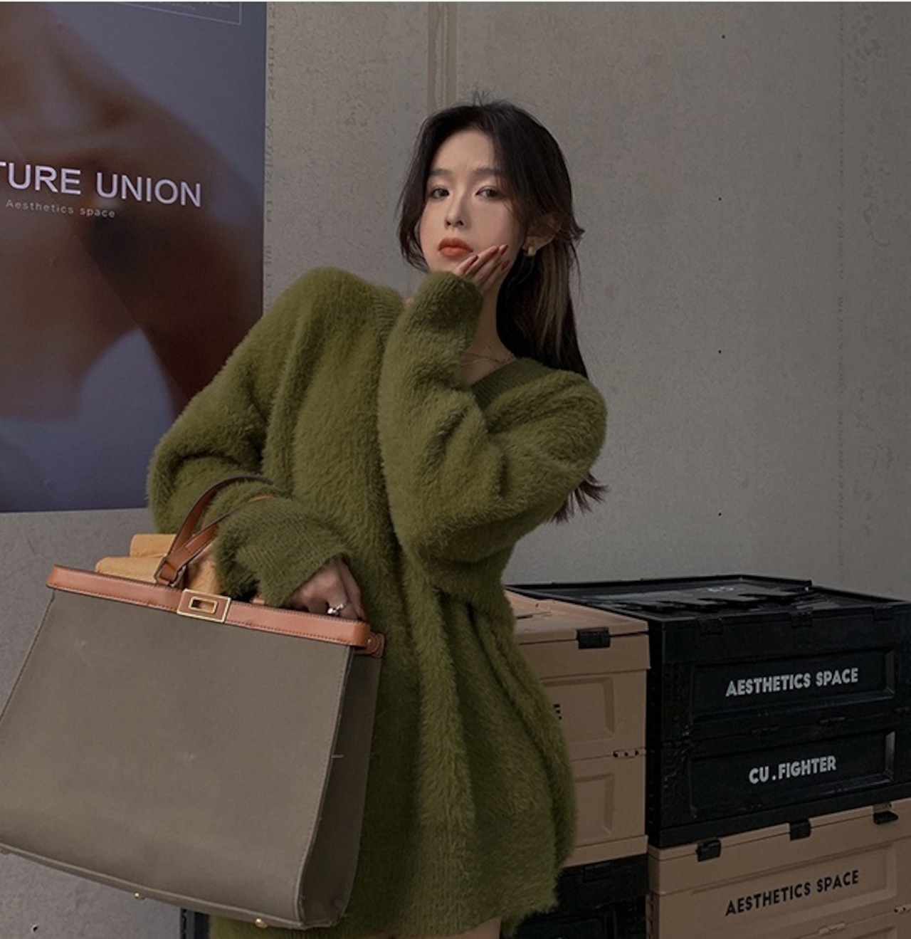 Vネックのルーズニット。