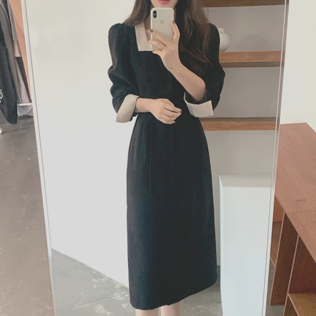 スクエアカラーのきれいめワンピース。