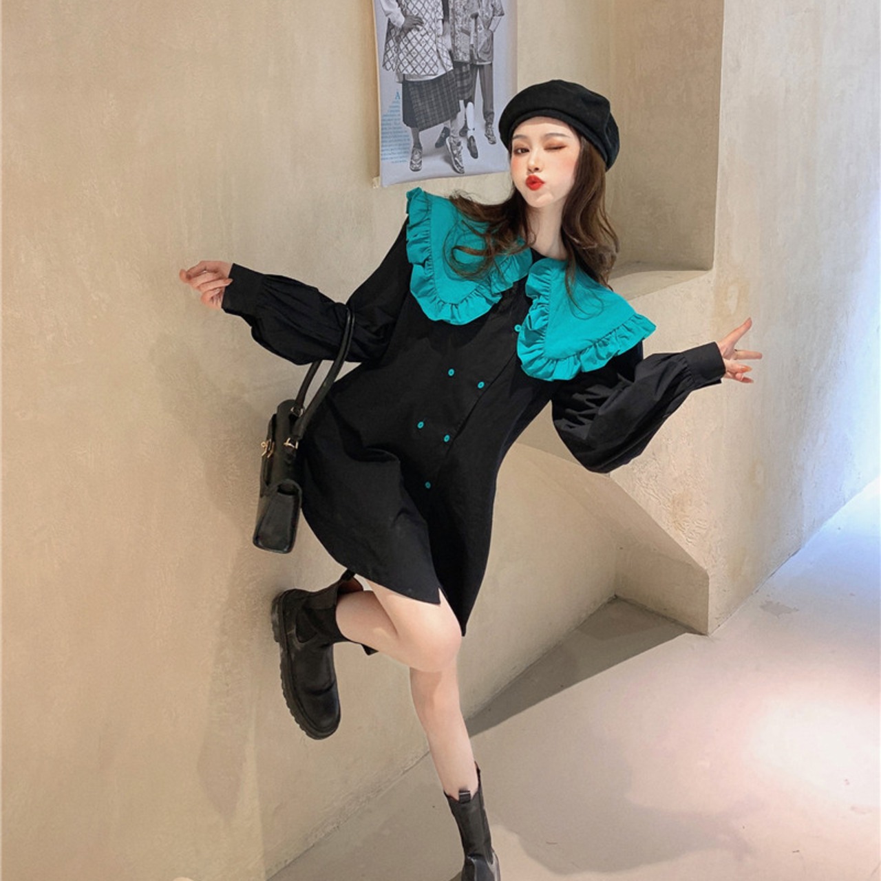 シャツワンピース ワンピース レトロ フリル襟 大きめ襟 ミニ丈 フェミニン ガーリー ママコーデ デート お出かけ MH2578