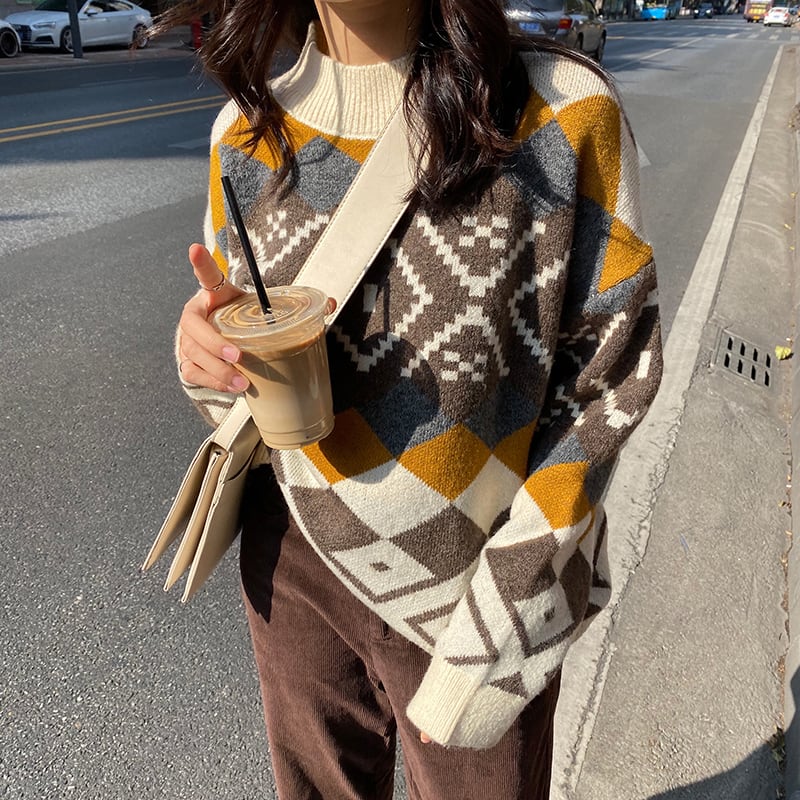 ニット セーター ハーフネック トップス ひし形柄 カジュアル ママコーデ 通勤 冬 デート お出かけ MH2604