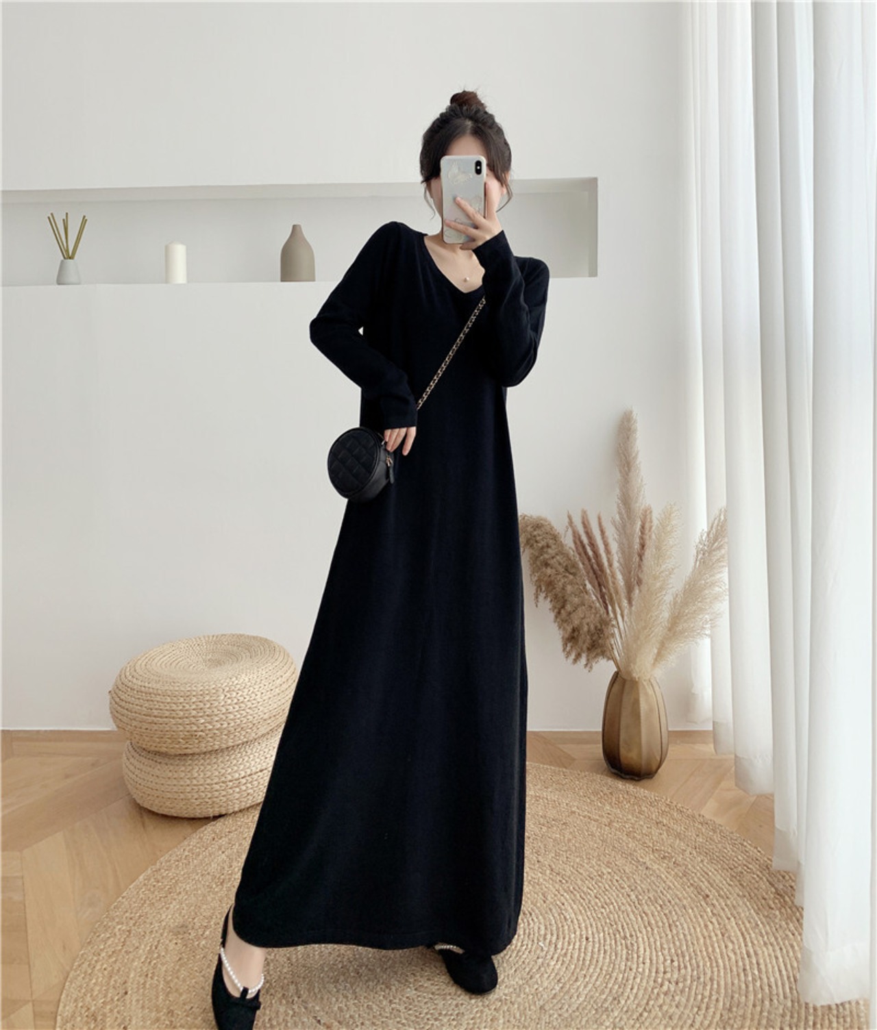 ワンピース Vネック ロング丈 マキシ丈 長袖 シンプル カジュアル ママコーデ デート お出かけ MH2606