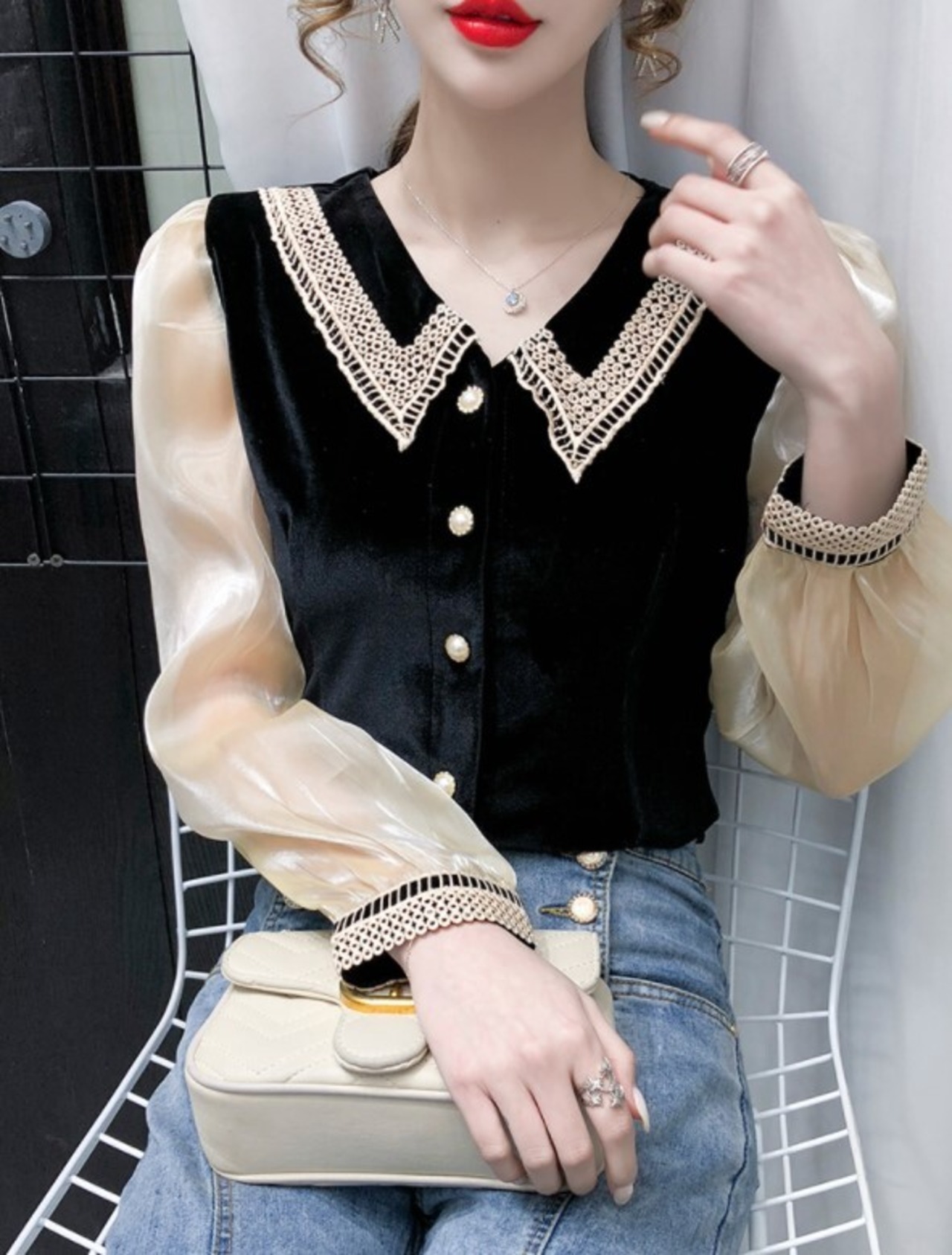 シャツ プルオーバー レディース トップス 異素材 春秋 Vネック 長袖 サテン ガーリー フレアスリーブ ab1883