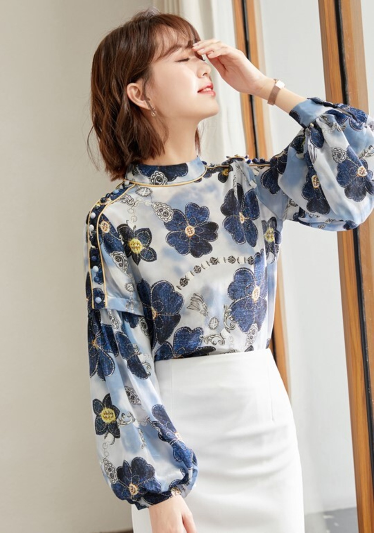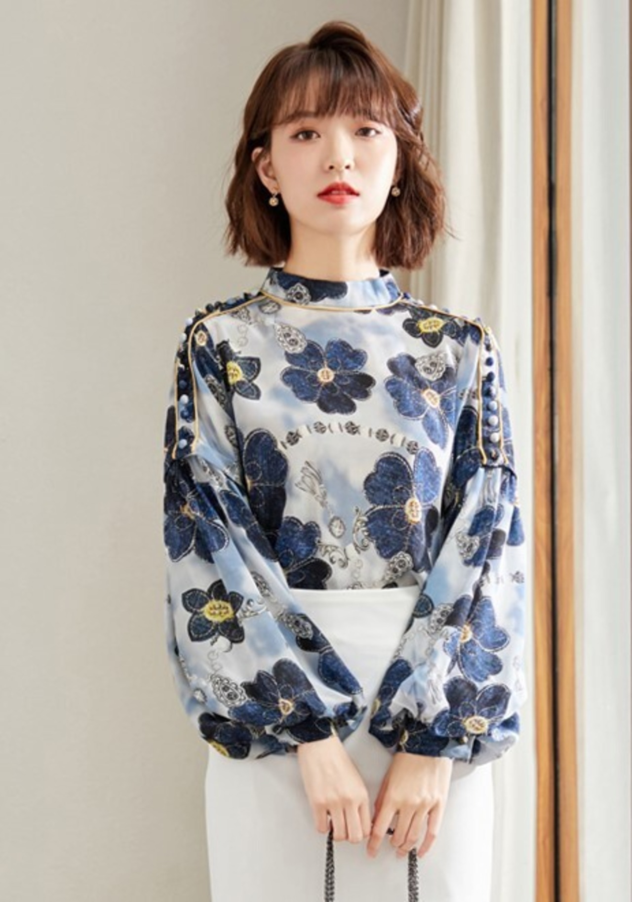 シャツ プルオーバー トップス レディース 春秋 花柄 ハイネック ランタンスリーブ 長袖 エレガント ボタン プチプラ ab1892
