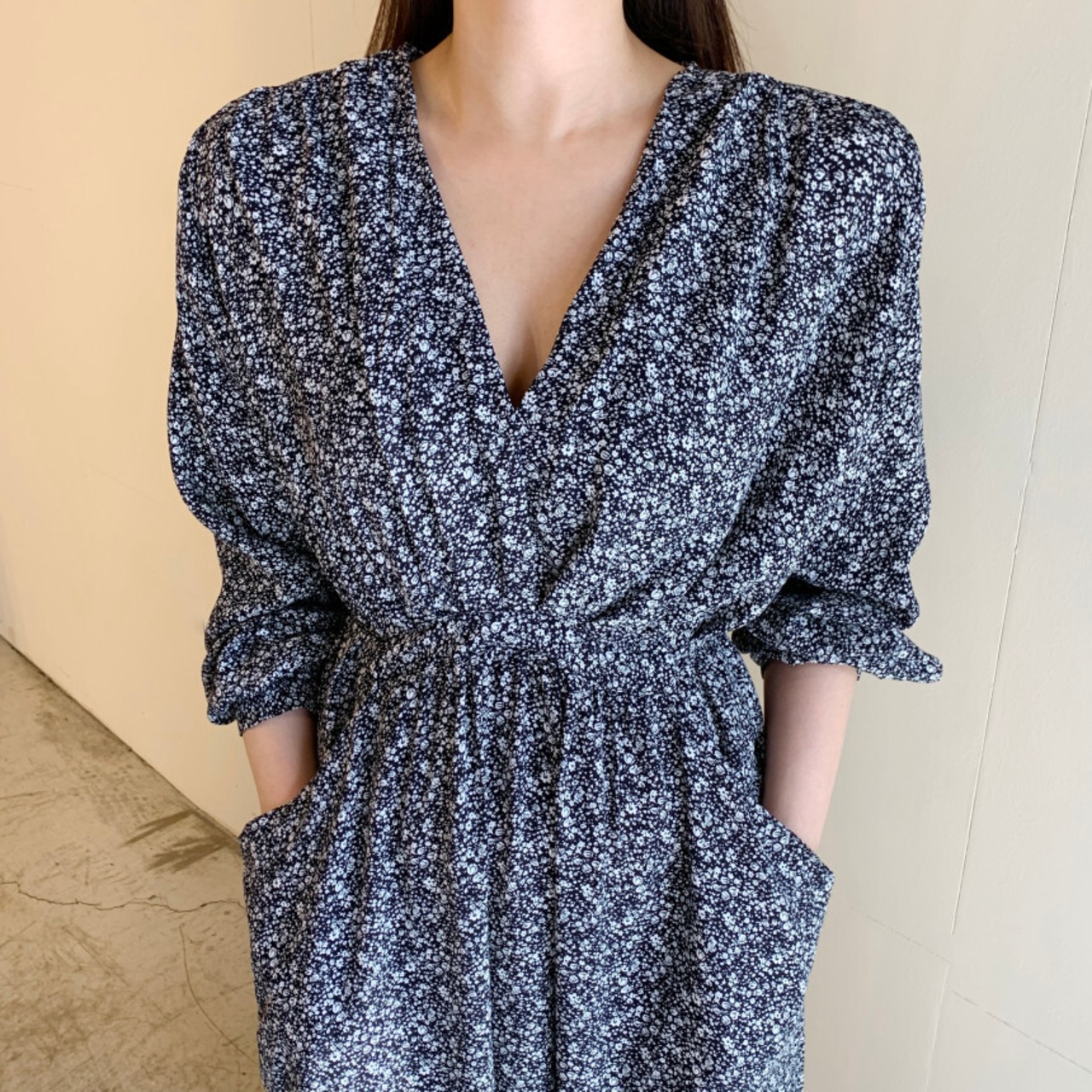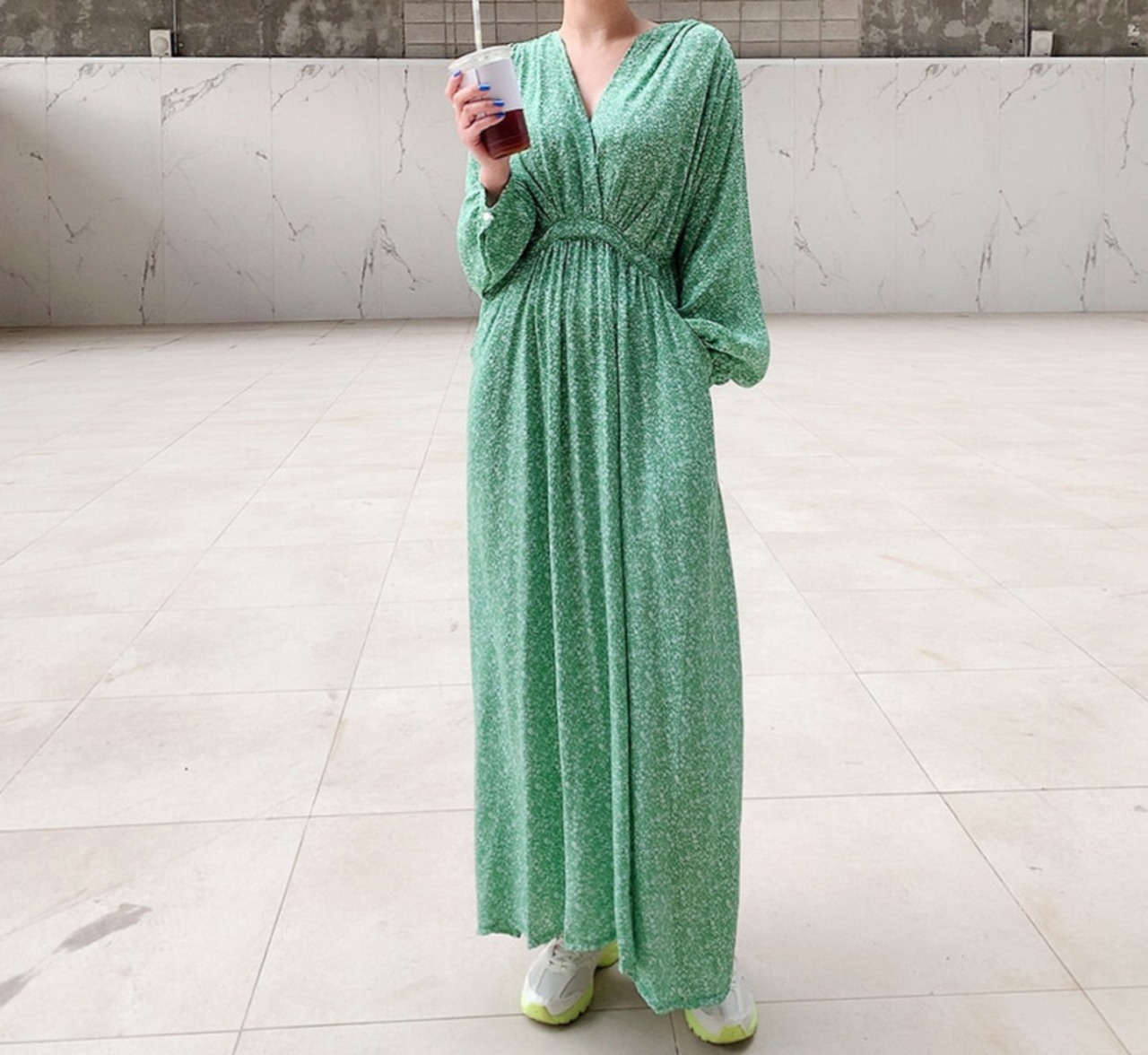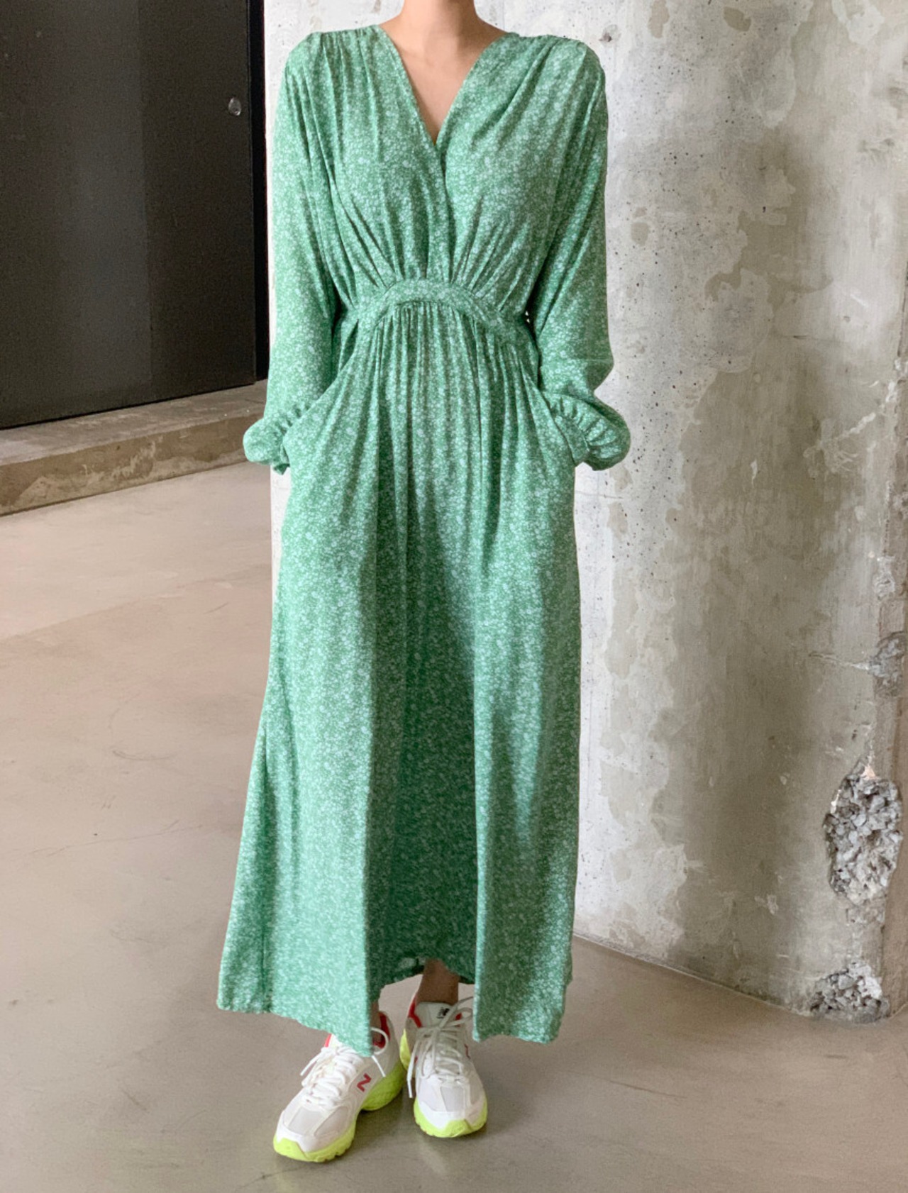 ワンピース 花柄 Vネック ロング丈 長袖 春 ママコーデ 大人可愛い 爽やか ゆったり デート お出かけ MH2652