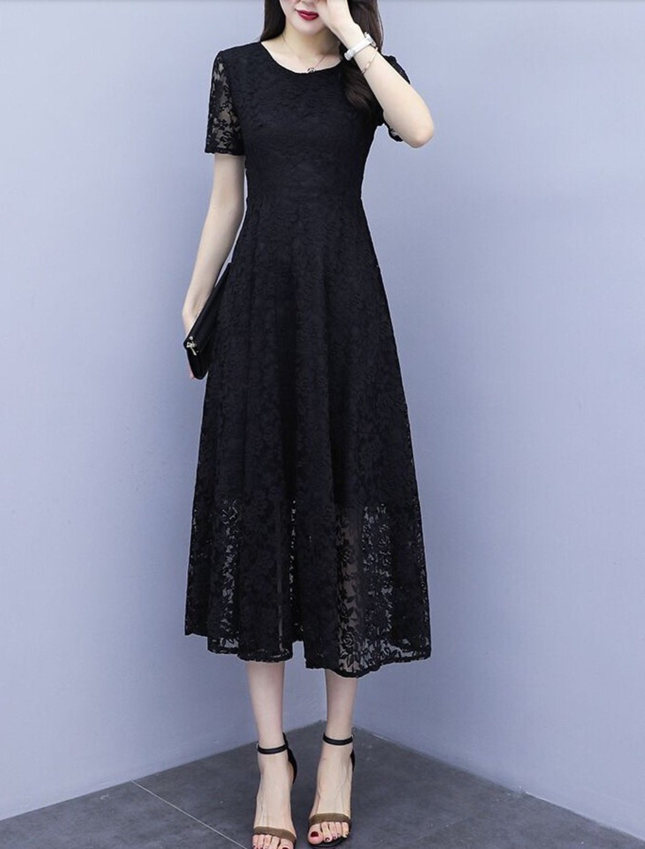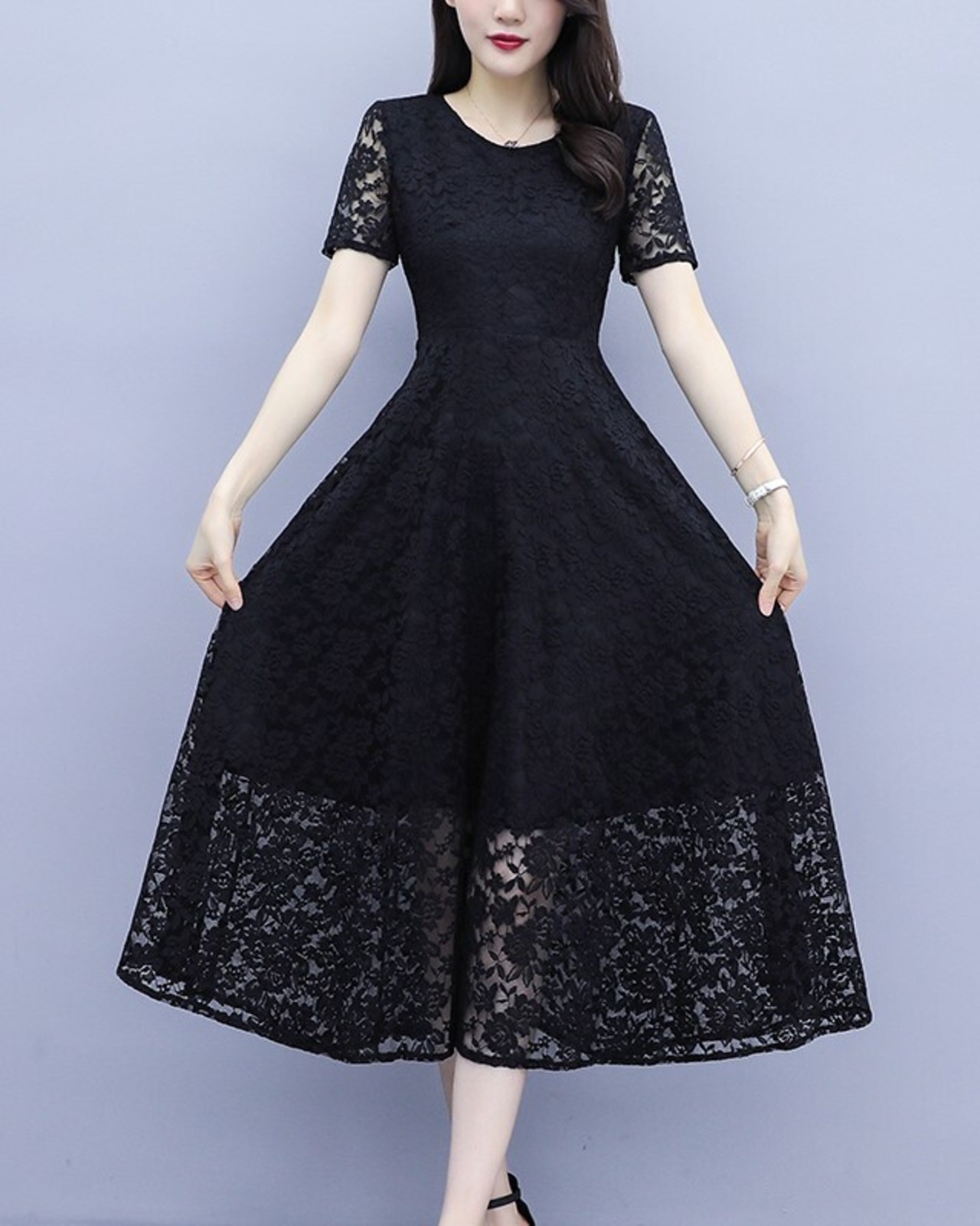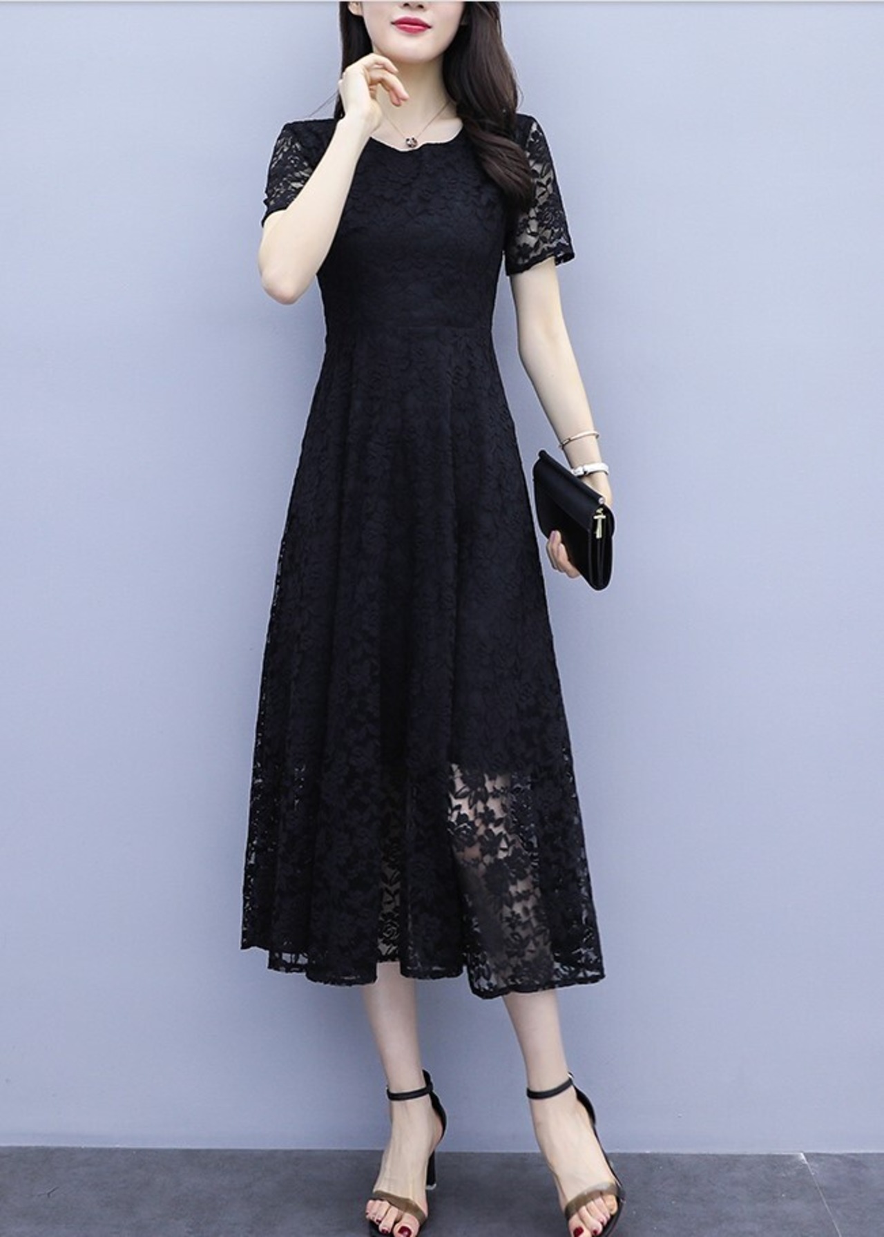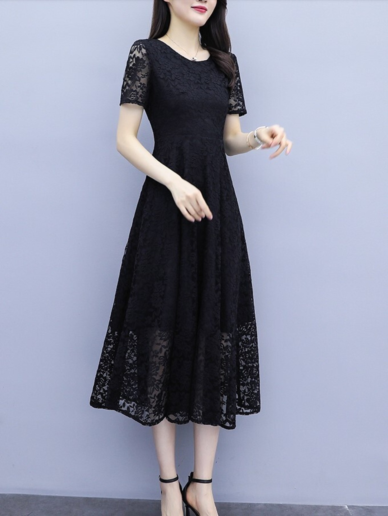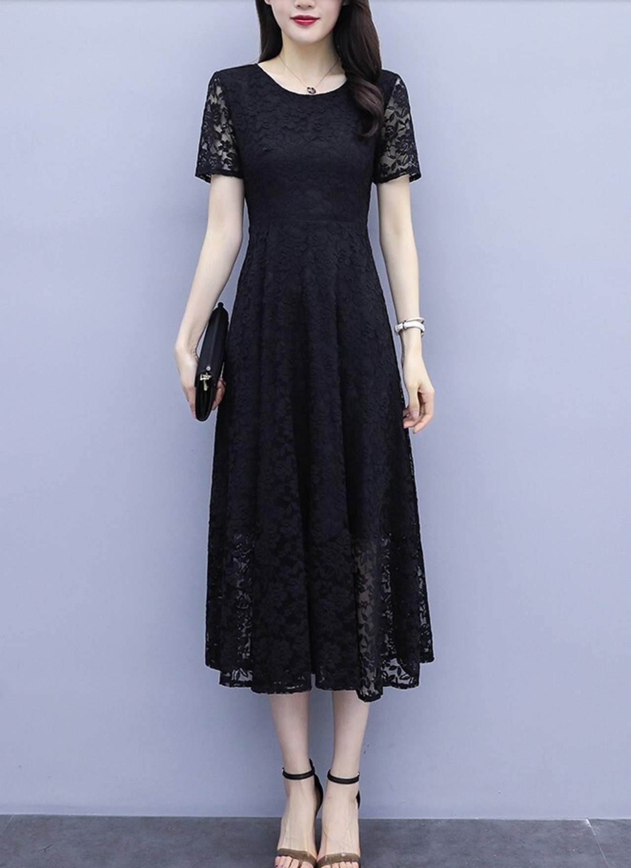 ワンピース レディース フォーマル レースワンピ ミモレ丈 半袖 花レース ラウンドネック Aライン お呼ばれ パーティー 大きいサイズ シック ab1910