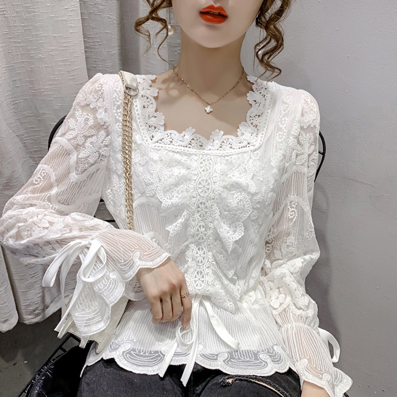 清楚感漂うススクエアカラーレースブラウス。