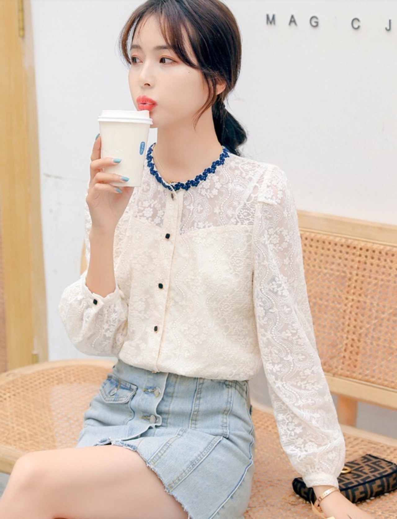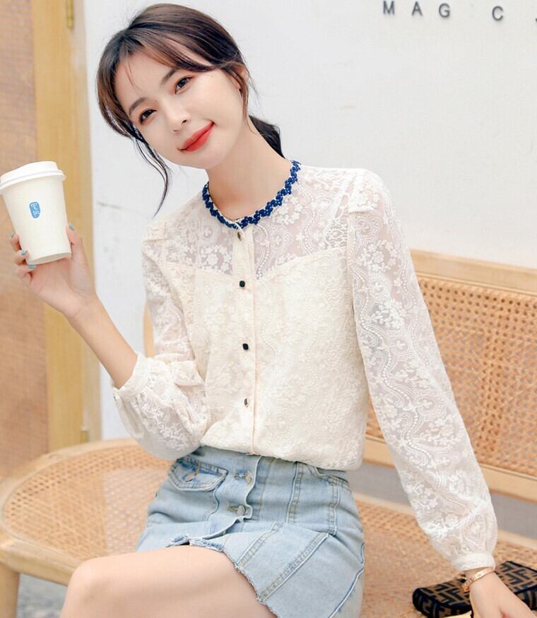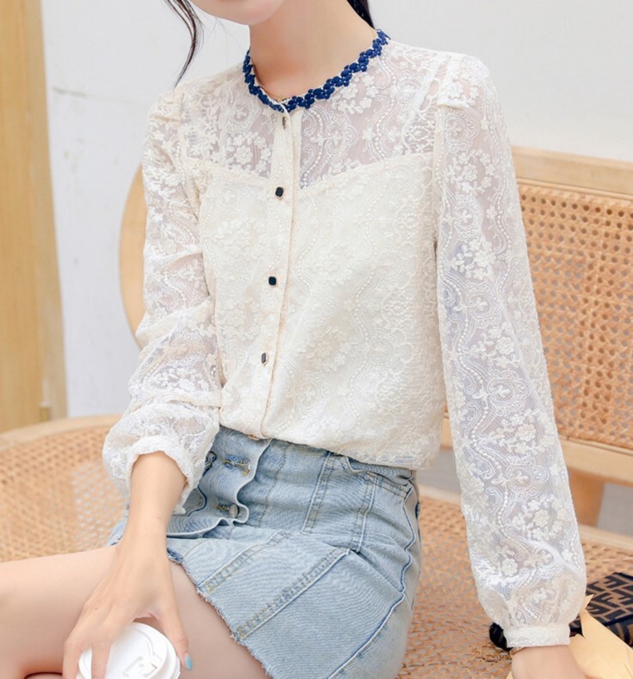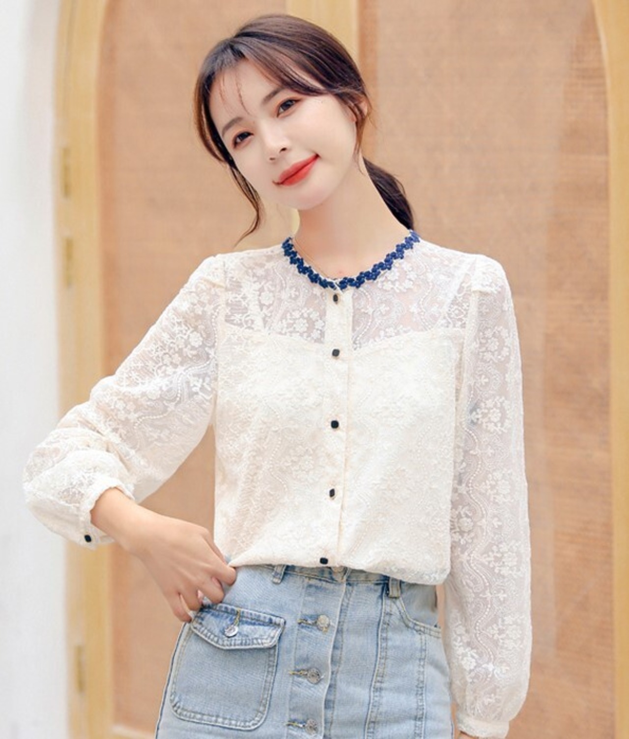 トップス プルオーバー シャツ レース レディース 春秋 長袖 ラウンドネック 透け感 花レース フェミニン ガーリー ab1917