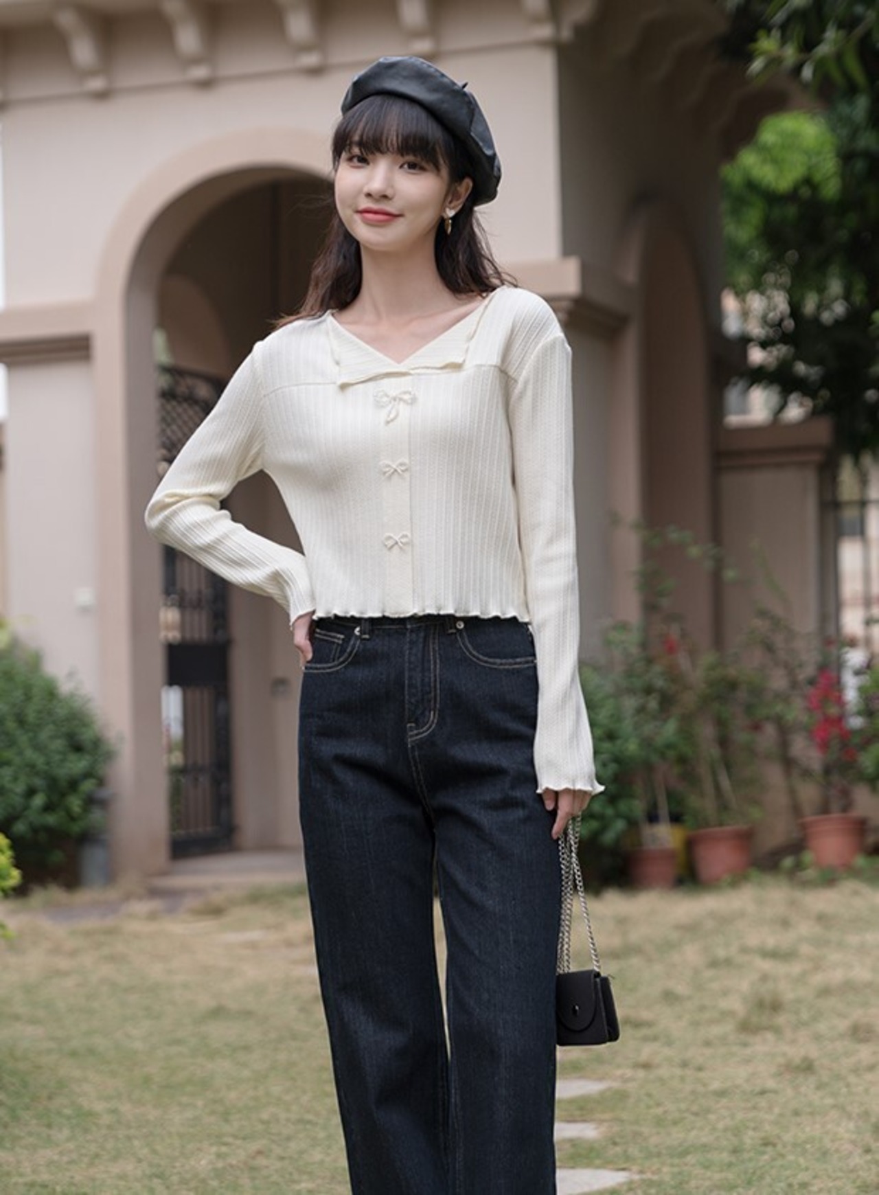 ニット トップス プルオーバー 春秋 春ニット レディース 長袖 リボン Vネック ガーリー プチプラ 無地 ab1921