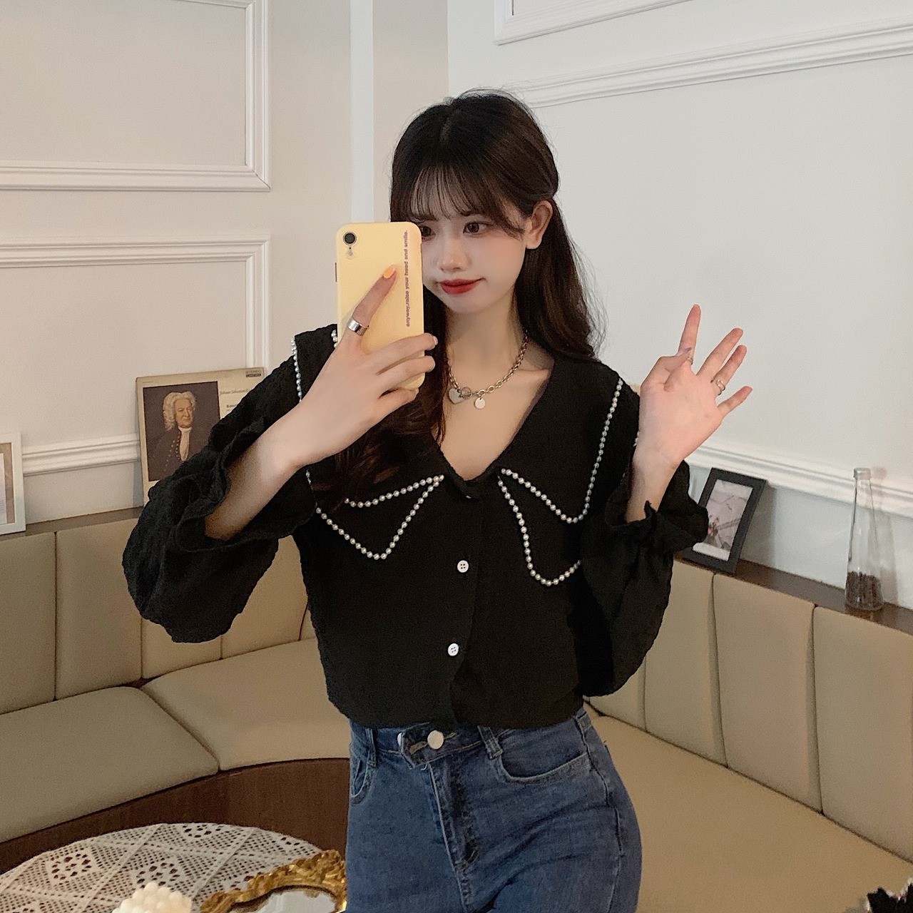 ブラウス シャツ トップス レディース レトロ ビジュー付き ゆったり 大きいサイズ ブラック トランペットスリーブ ママコーデ デートお出かけ MH2741