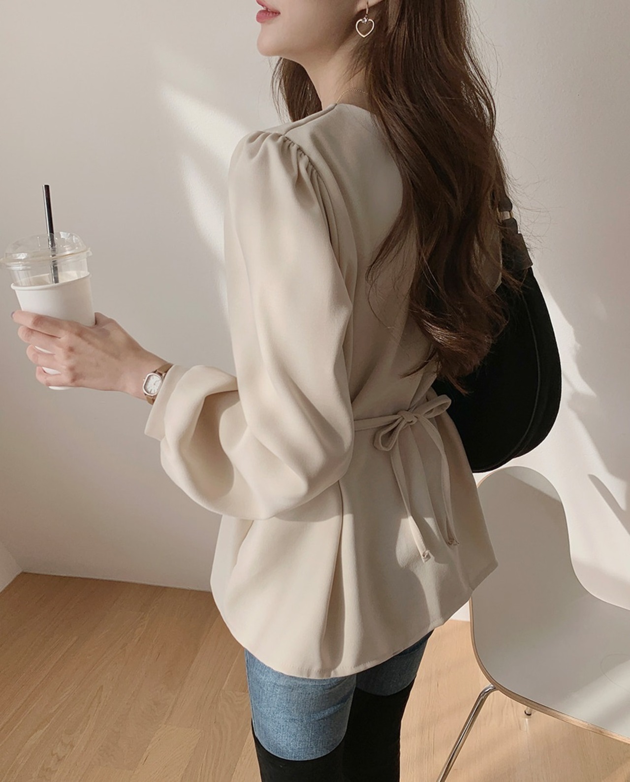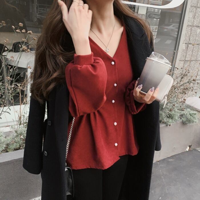 ブラウス シャツ トップス レディース ランタンスリーブ Vネック レトロ 大人可愛い 通勤 ママコーデ デート お出かけ MH2750