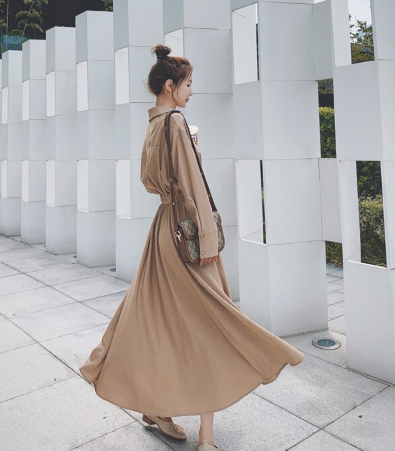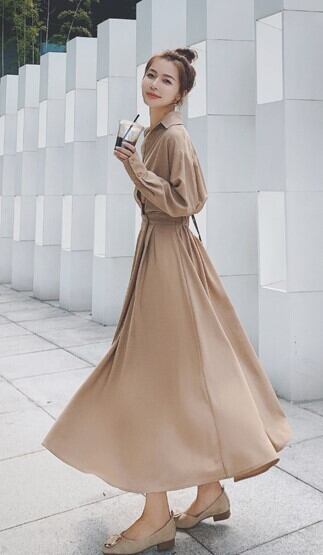 ワンピース レディース 春秋 春ワンピ ロング丈 無地 長袖 Vネック ハイウエスト オフィス 通勤 ママコーデ Aライン ab1934