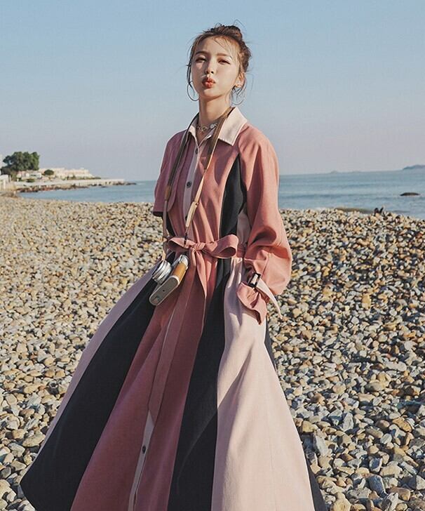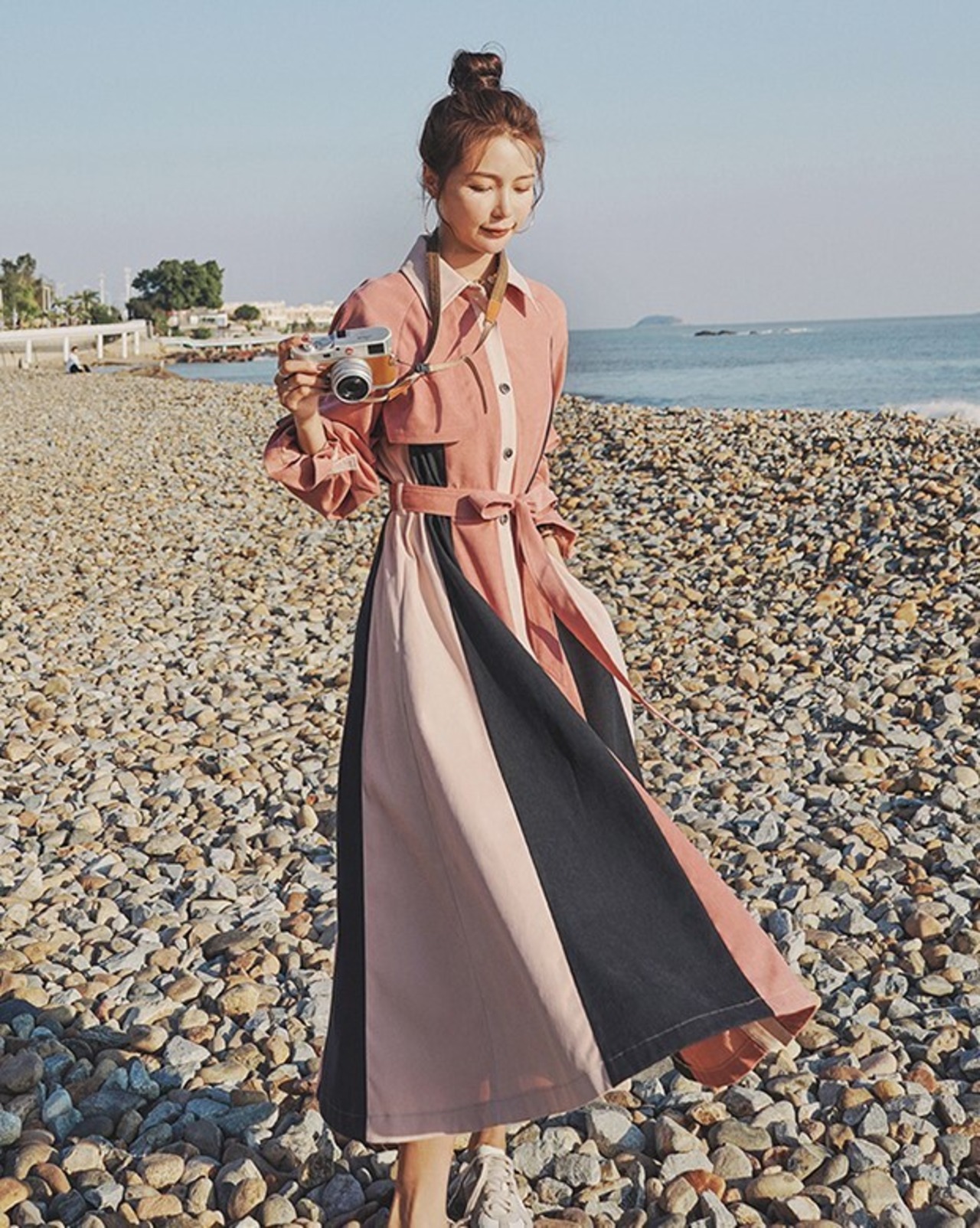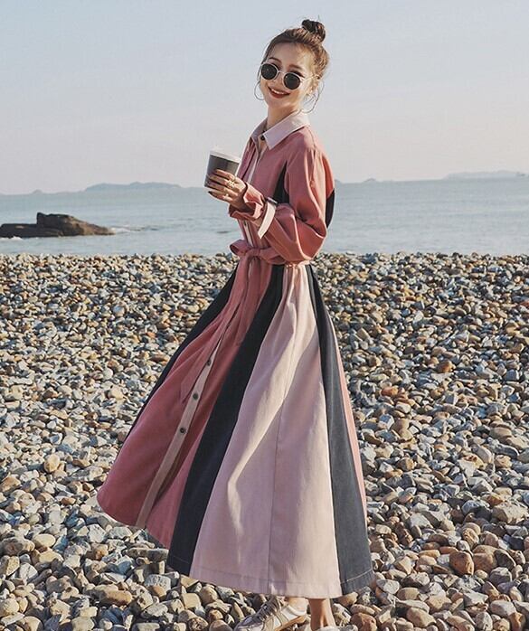 ワンピース レディース 春ワンピ シャツワンピ ミモレ丈 トリコロール エレガント 長袖 ガーリー ふんわり ハイウエスト ab1937