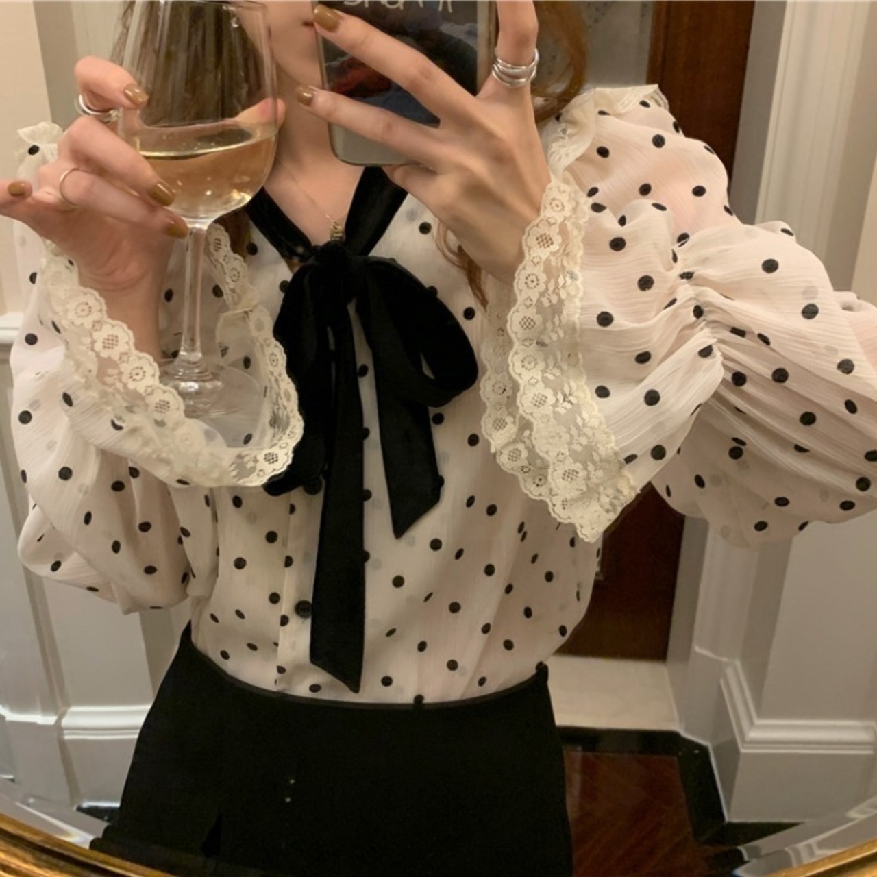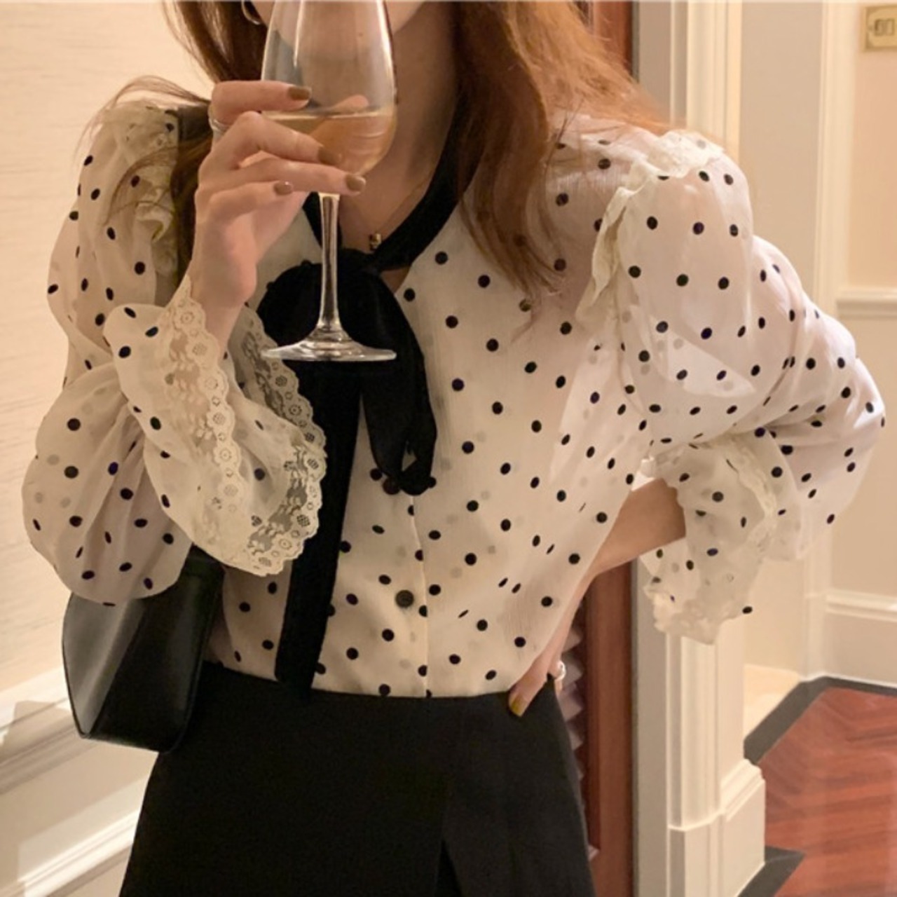 ブラウス シャツ トップス レディース ドット柄 シフォン ベルスリーブ ボウタイ レトロ フェミニン ガーリー デート お出かけ MH2751