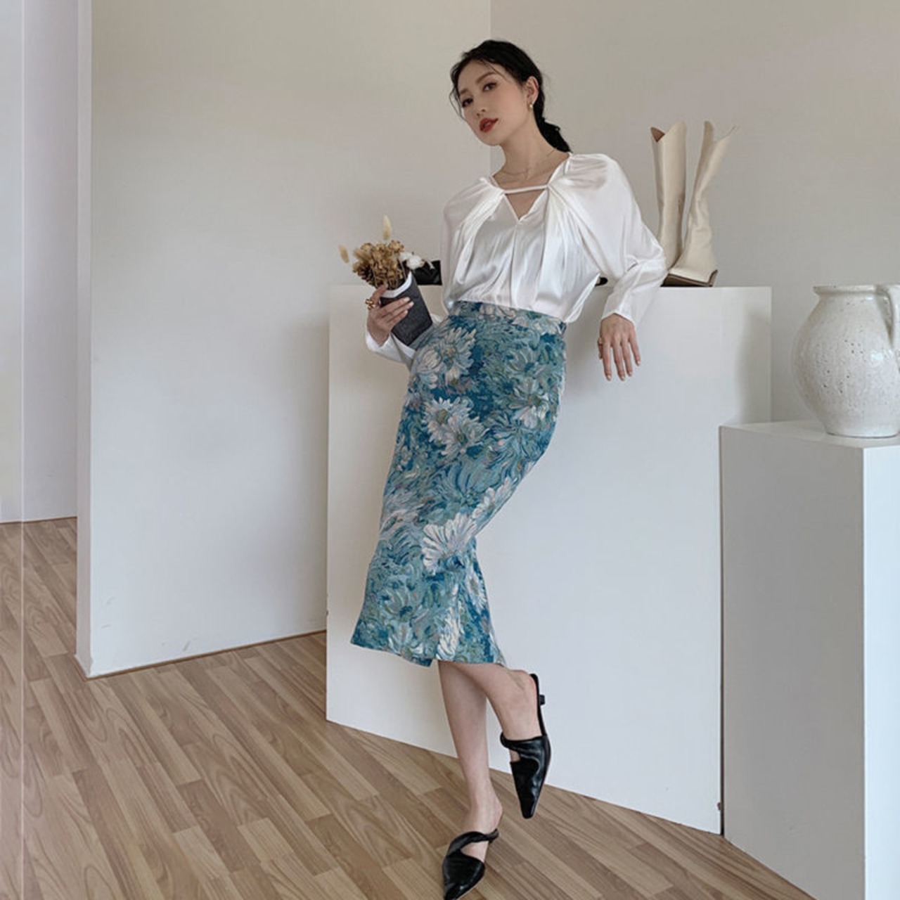 スカート ミモレ丈 花模様 花柄 レトロ 油絵風 大人可愛い ママコーデ 通勤 OL デート お出かけ MH2766