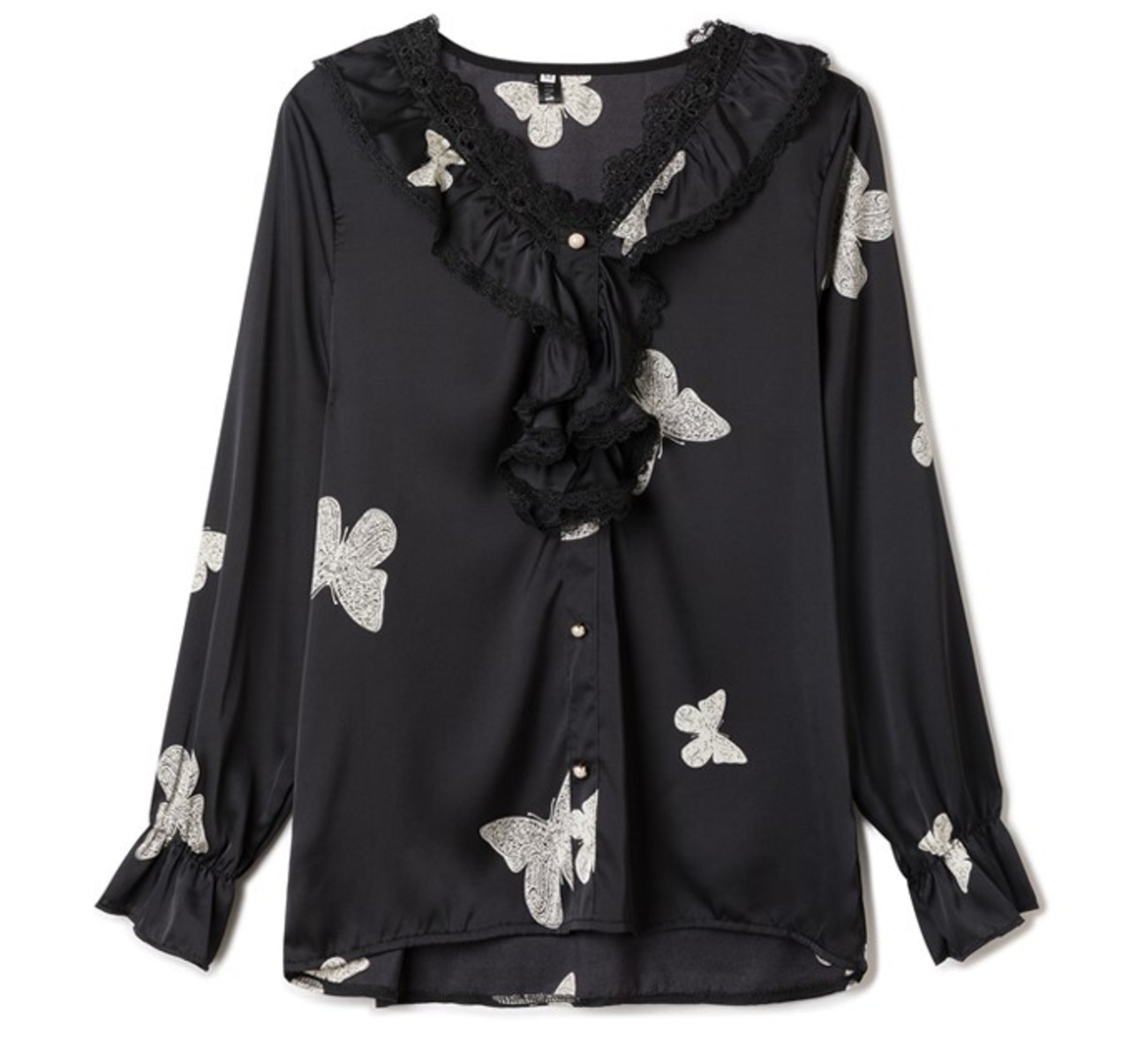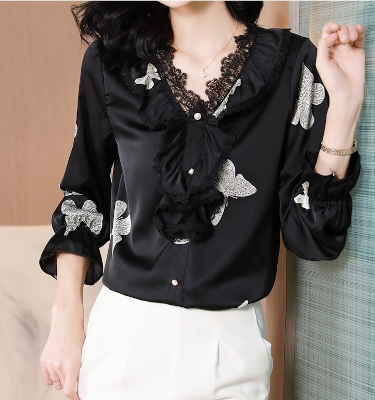 シャツ ブラウス レディース プルオーバー フリル 大きいサイズ Vネック 蝶 春夏 長袖 フェミニン ab1952
