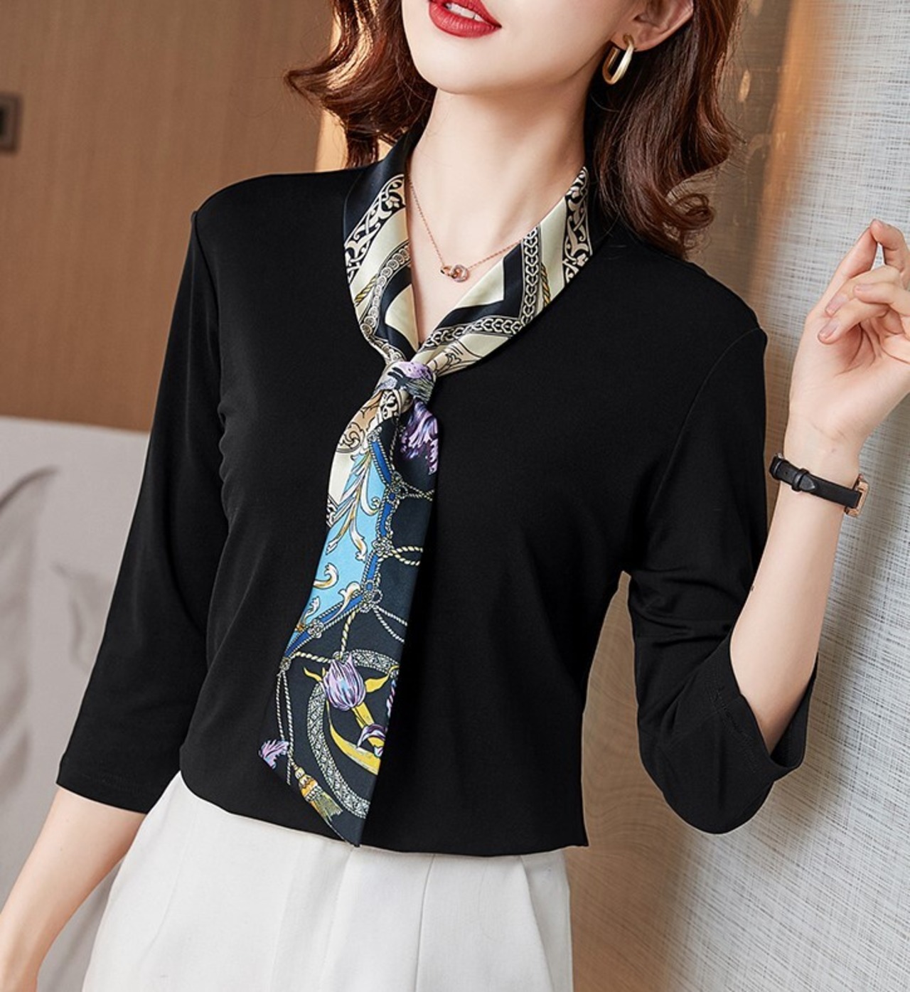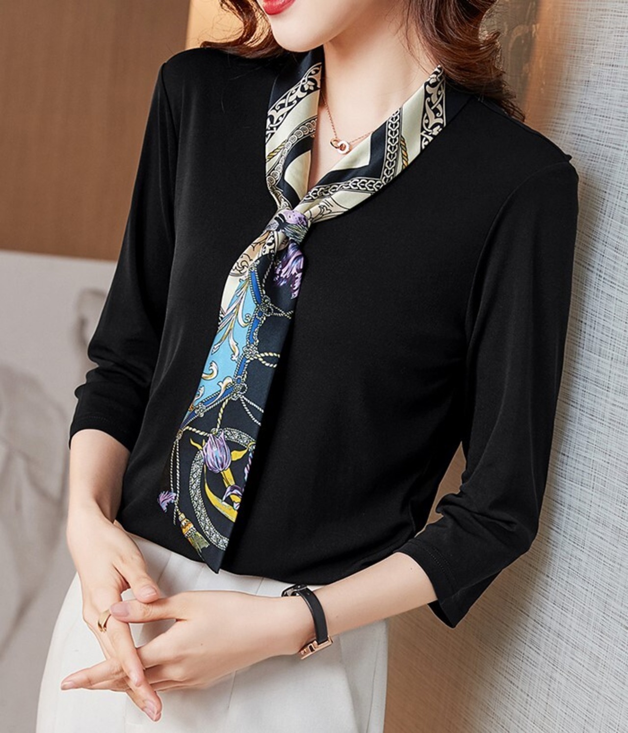 シャツ プルオーバー 春秋 レディース 大きいサイズ スカーフ タイ 七分袖 オフィス ママコーデ シック ab1957