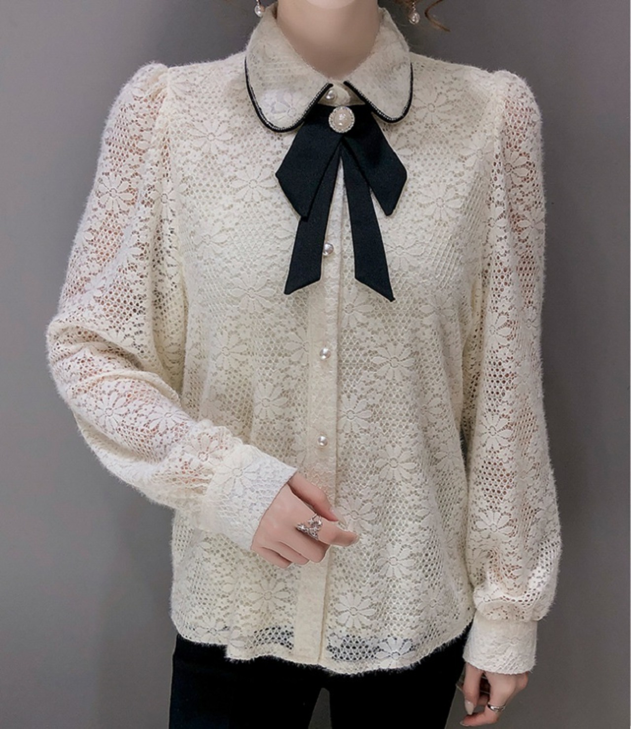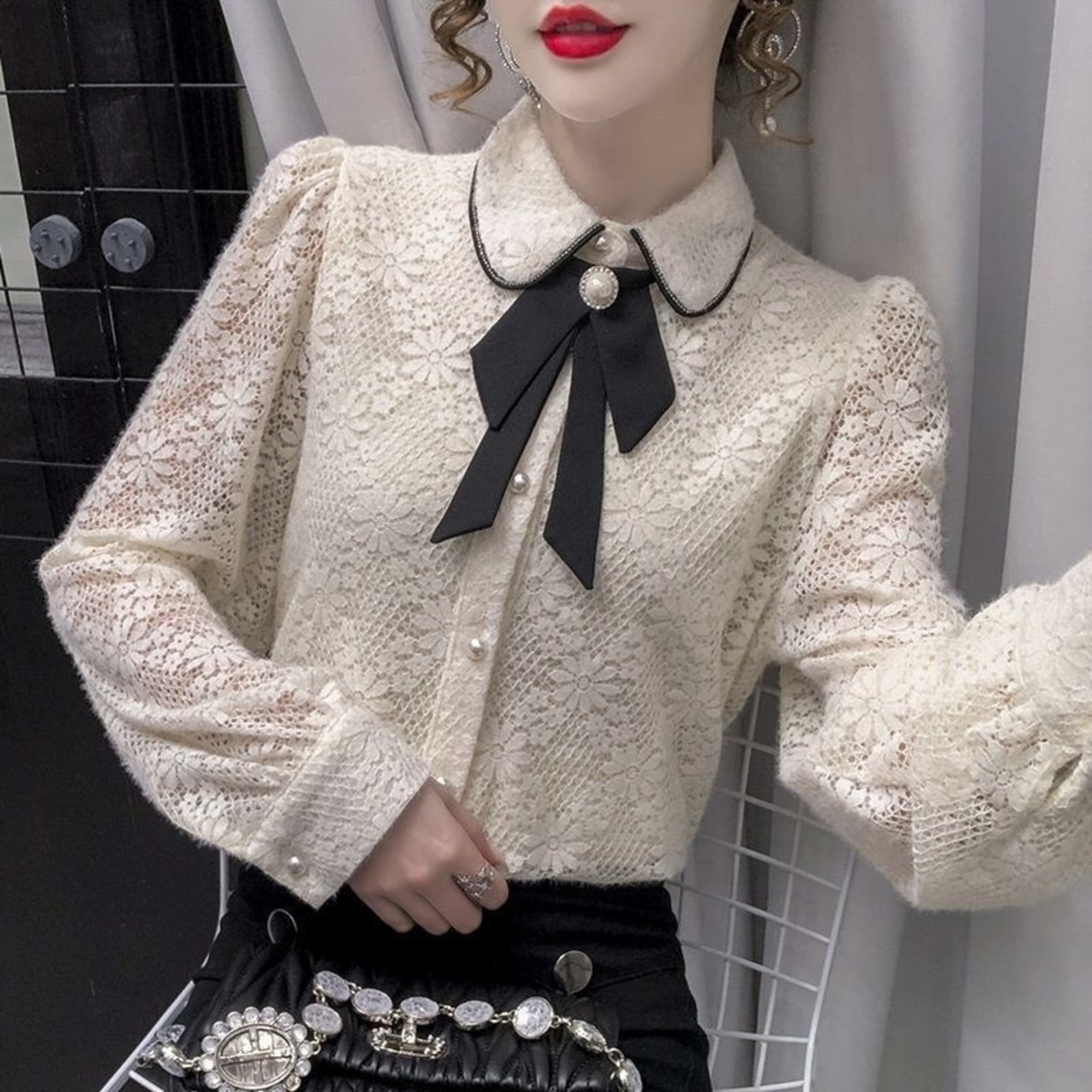 ブラウス トップス レディース 長袖 レース リボンタイ パールボタン きれいめ 通勤 OL ママコーデ デート お出かけ MH2811