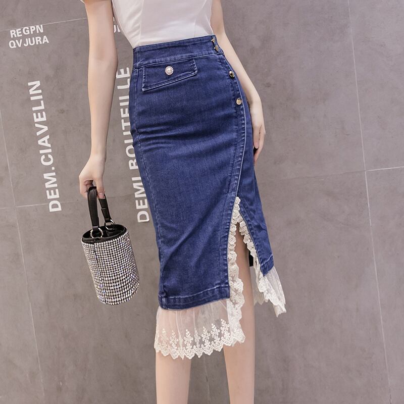 スカート デニム ミモレ丈 レディース スリット入り レース付き ハイウエスト フェミニン ガーリー カジュアル ママコーデ デート お出かけ MH2833
