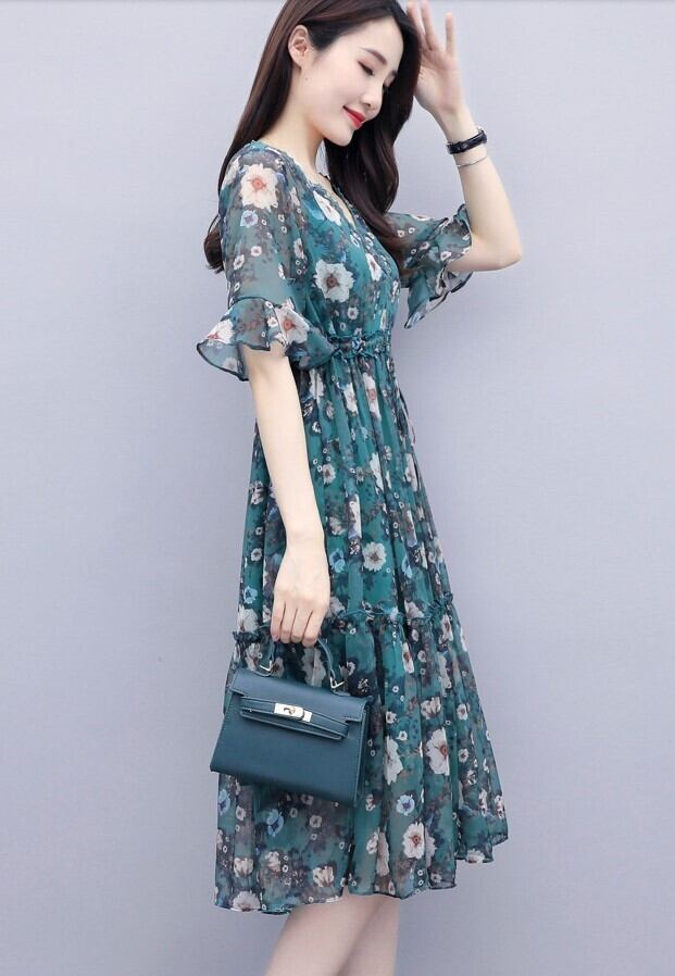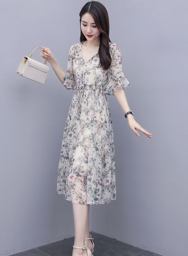 シフォンワンピース ワンピース レディース 春夏 花柄 ひざ丈 ツーピース フリル Vネック フェミニン ab1962