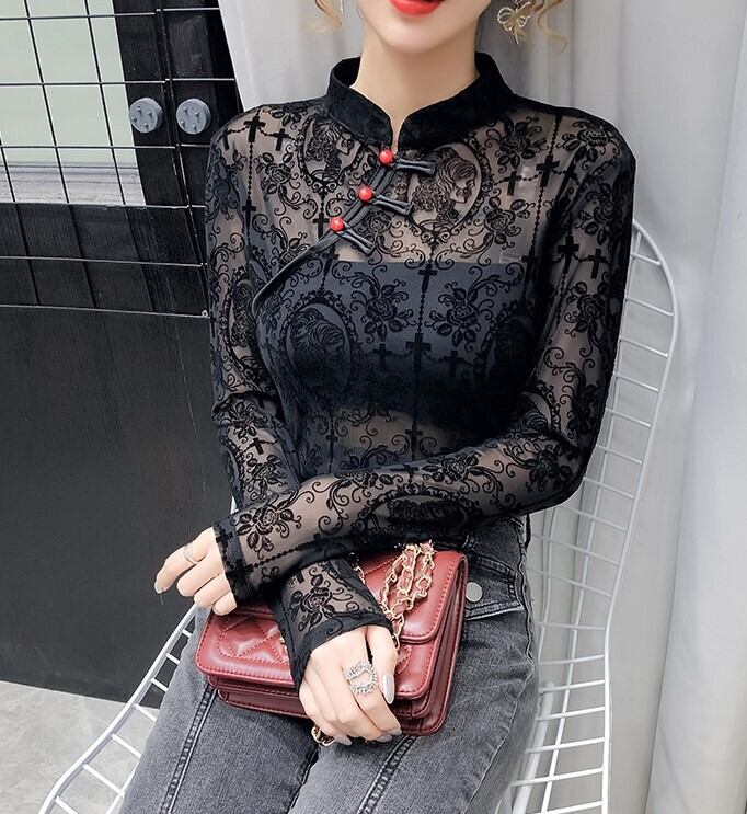 トップス プルオーバー 総レース チャイナ風 ハイネック 長袖 レースシャツ シャツ 春秋 透け感 エレガント シック ab1968