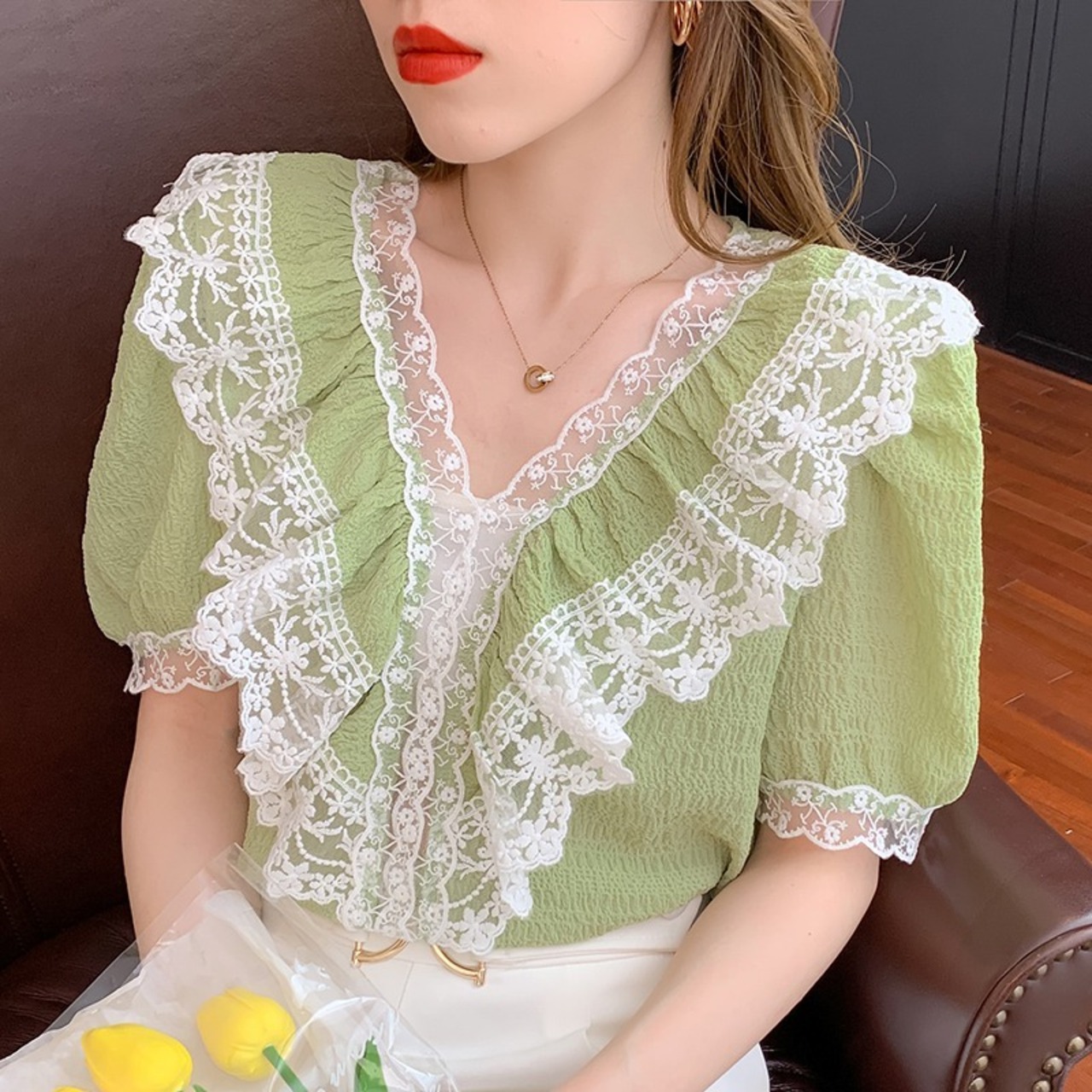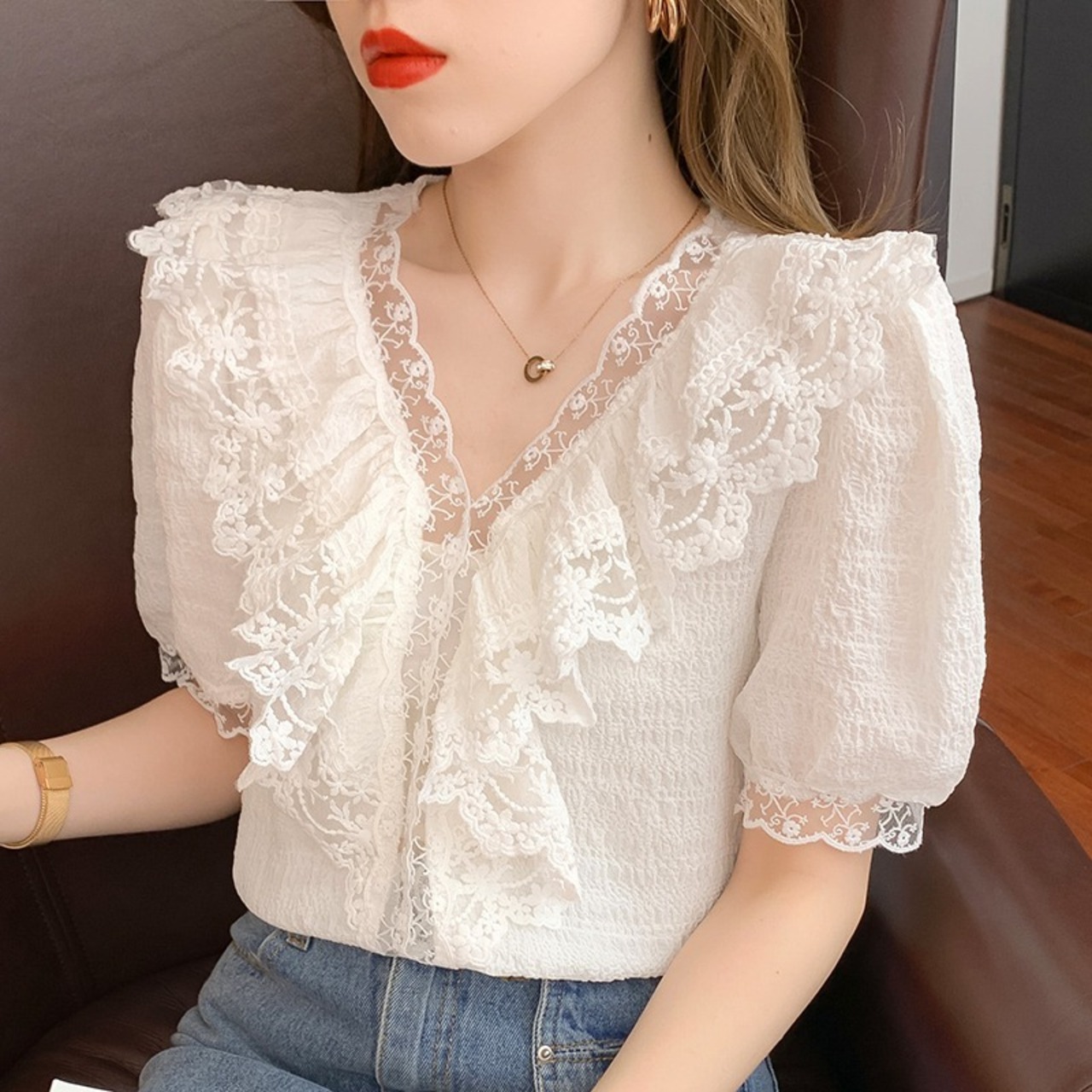 ブラウス Vネック トップス レディース 半袖 レース 甘め ガーリー 夏 通勤 OL ママコーデ デート お出かけ MH2861