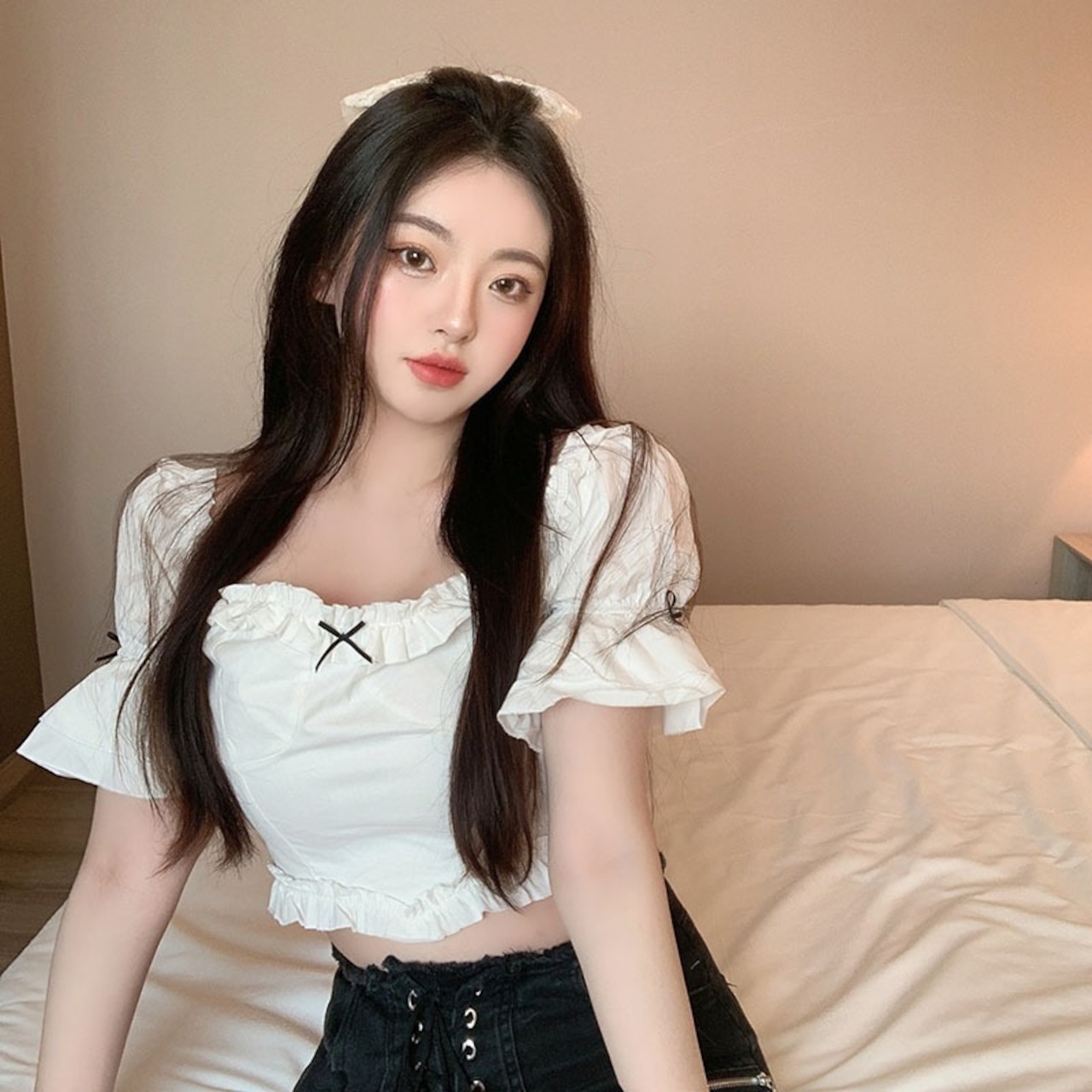 ブラウス トップス レディース フリル リボン ショート丈 スクエアネック ガーリー レトロ 夏 ヘルシー デート お出かけ MH2883