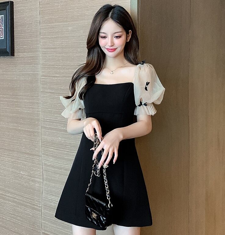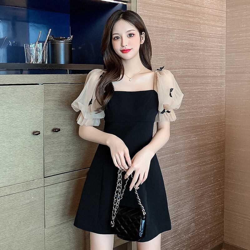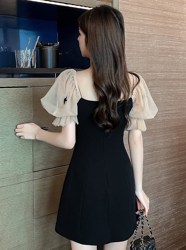 ドレス パーティードレス ワンピース レディース ミニ丈 ランタンスリーブ シアー 透け感 リボン パーティー 二次会 お呼ばれ MH2905