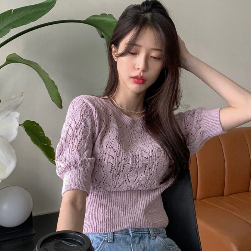 サマーニットプルオーバー トップス レディース ラウンドネック 半袖 サマーニット ニット カジュアル ママコーデ デート お出かけ MH2917