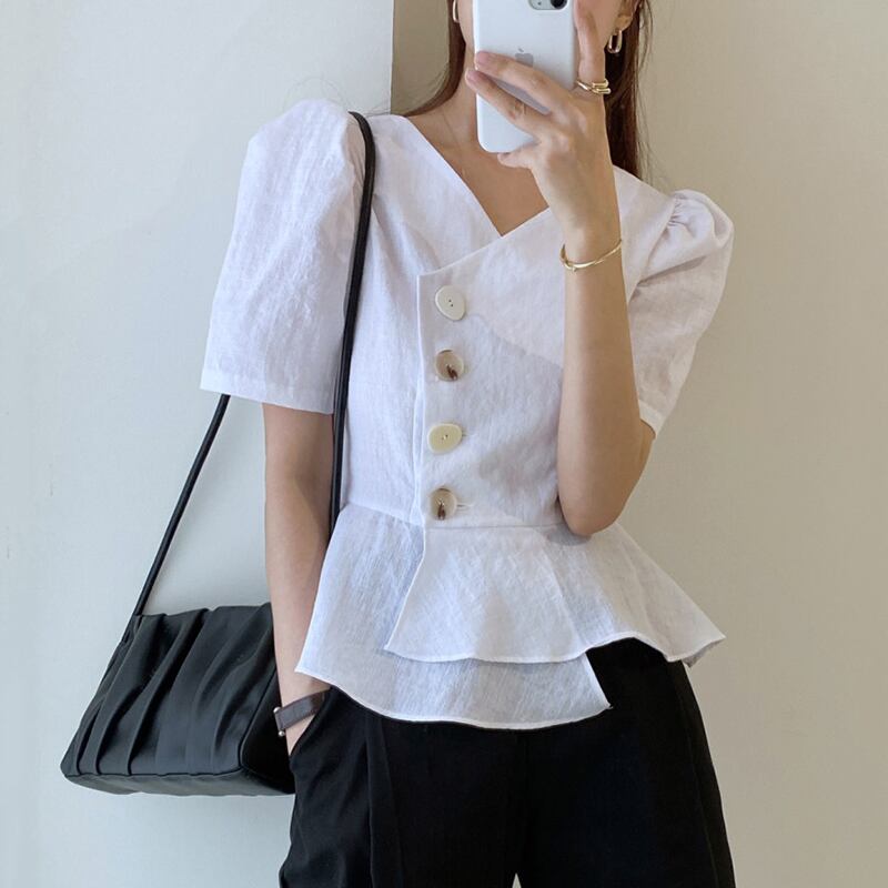 おしゃれで可愛いデザインボタンブラウス。