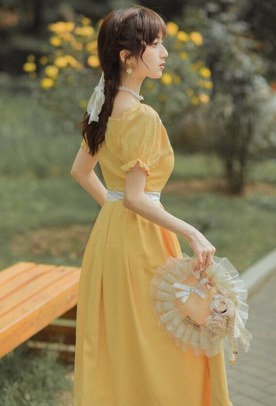 ワンピース 春夏 レディース レトロ プリンセス ドレス ハイウエスト ミモレ丈 パフスリーブ フリル Aライン フェミニン ab1981