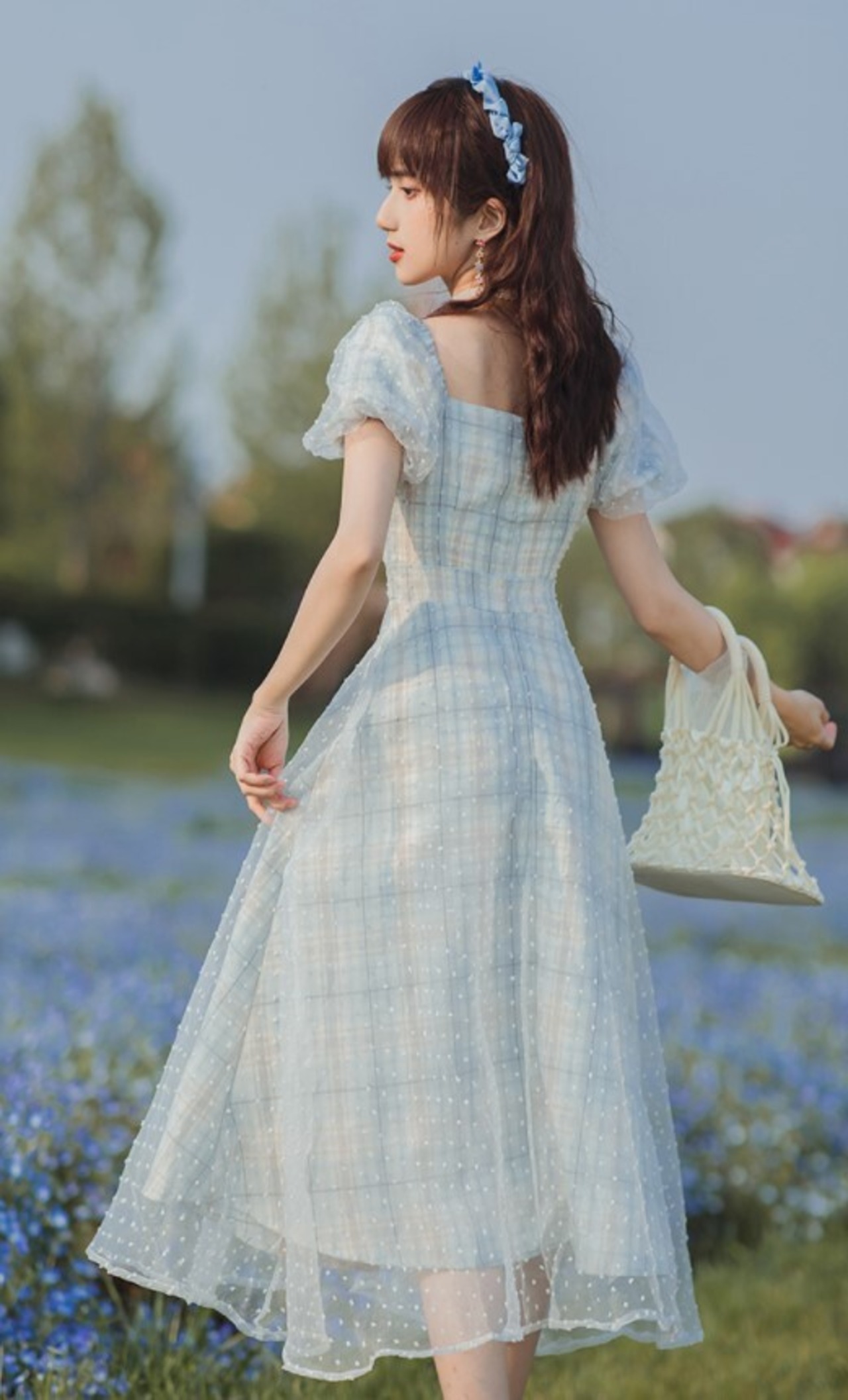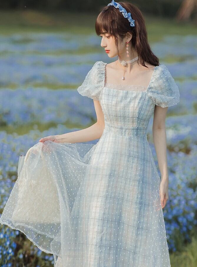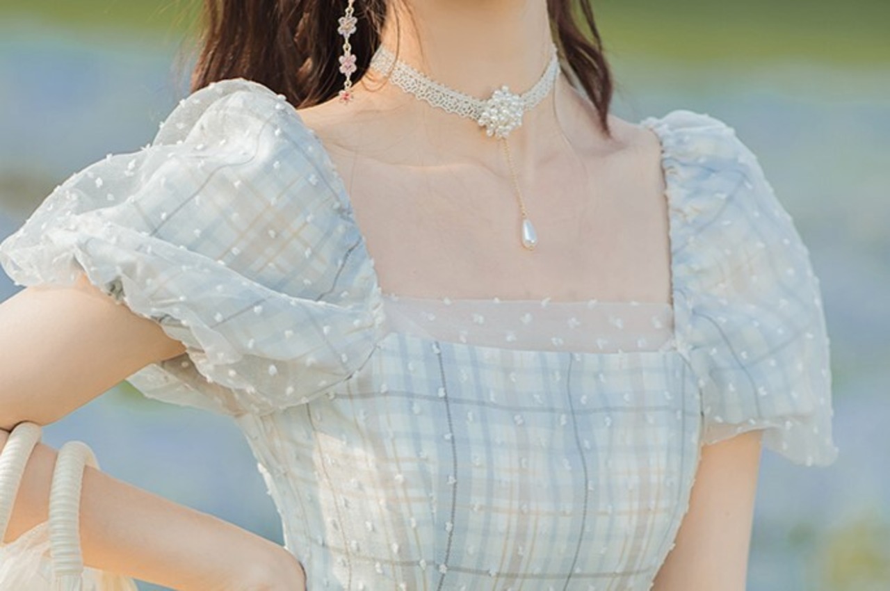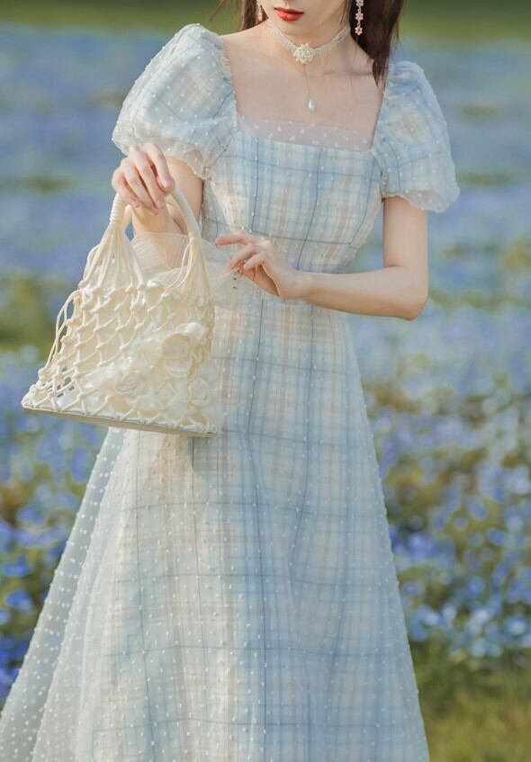ワンピース 春夏 レディース チェック ロング丈 レース パフスリーブ フェミニン キュート スクエアネック ハイウエスト ab1983