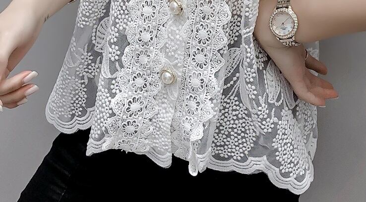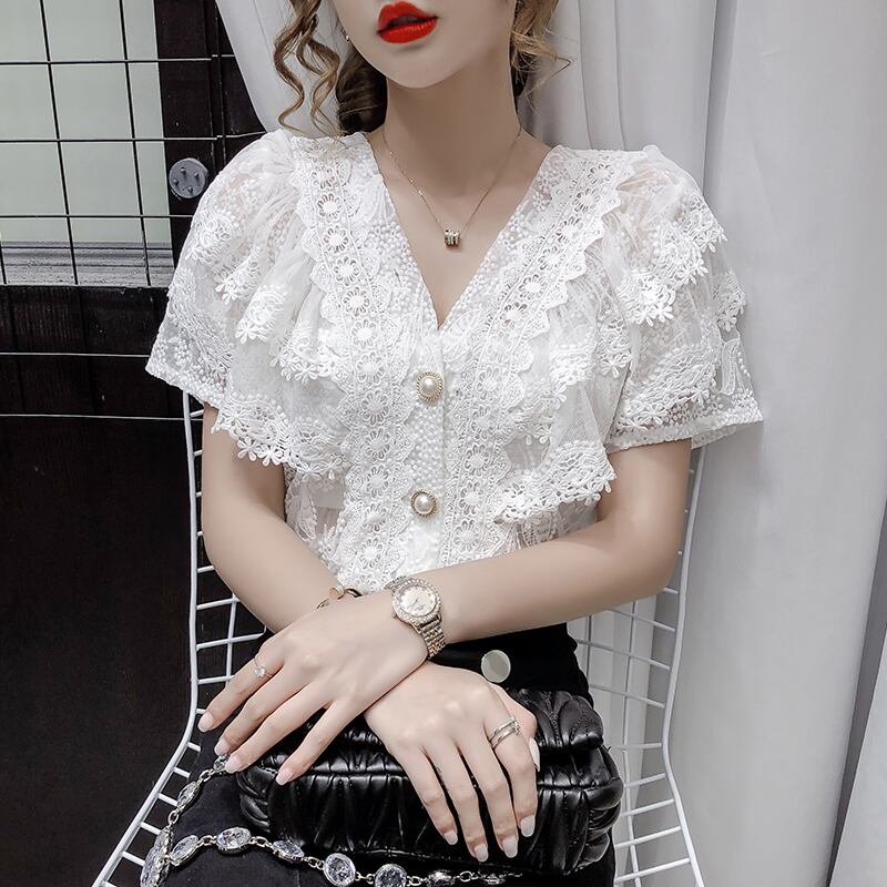 レースブラウス トップス レディース レース Vネック パールボタン 透け感 半袖 ガーリー おしゃれ デート お出かけ MH2959