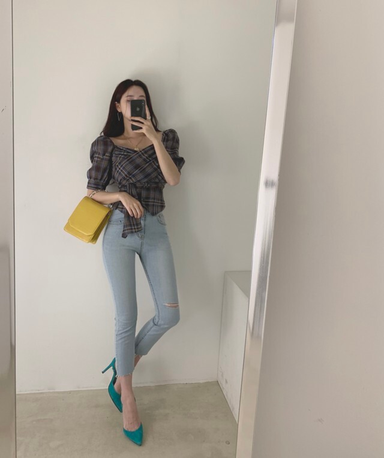 ブラウス トップス レディース チェック柄 カシュクール Vネック ウエストリボン ガーリー 夏 デート お出かけ MH2965