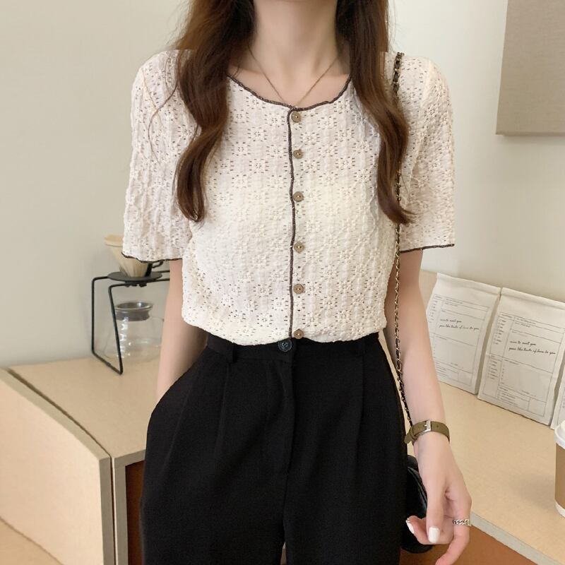 ブラウス トップス レディース 半袖 薄手 透け感 夏 ショート丈 ガーリー ママコーデ デート お出かけ MH3008