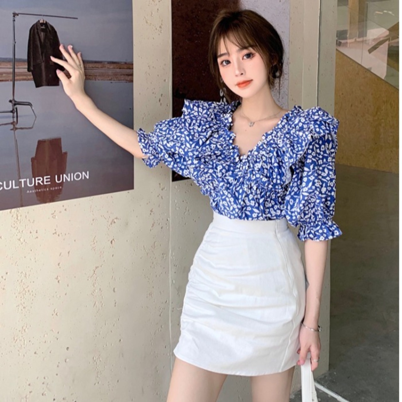 ブラウス トップス レディース Vネック 花柄 レトロ フリル 大人可愛い ガーリー デート お出かけ MH3026