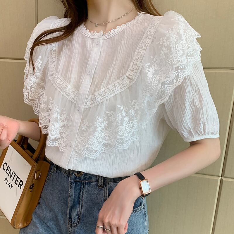 ブラウス トップス レディース 半袖 レース フリル 夏 爽やか 清楚 大きいサイズ フェミニン ママコーデ デート お出かけ MH3040