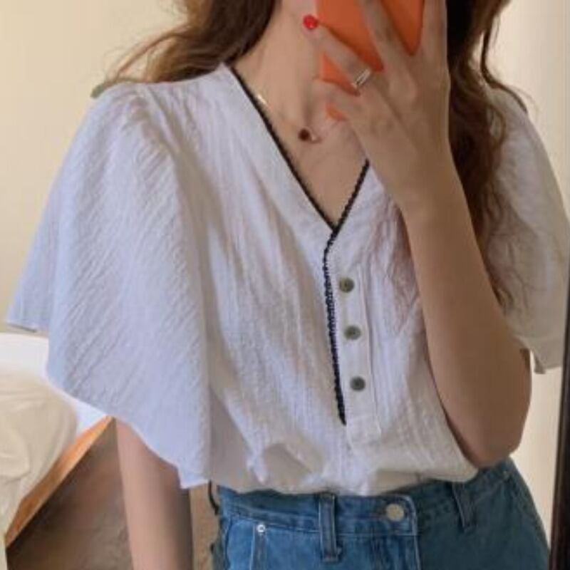 ブラウス トップス レディース 半袖 Vネック レトロ カジュアル 夏 コットン ママコーデ デート お出かけ 通勤 MH3052