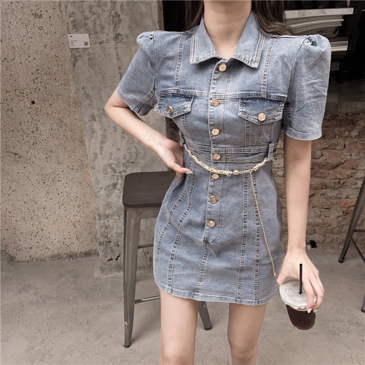 ミニ丈のデニムワンピース。