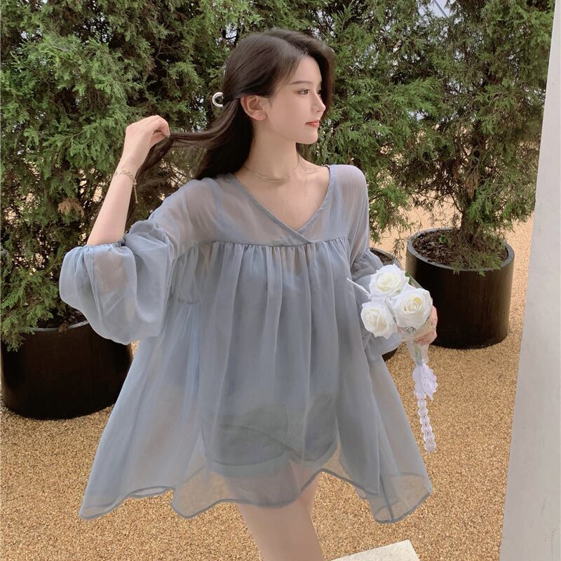 ブラウス トップス レディース シフォン シアー 透け感 Vネック インナー付き 夏 軽やか ママコーデ デート お出かけ MH3080