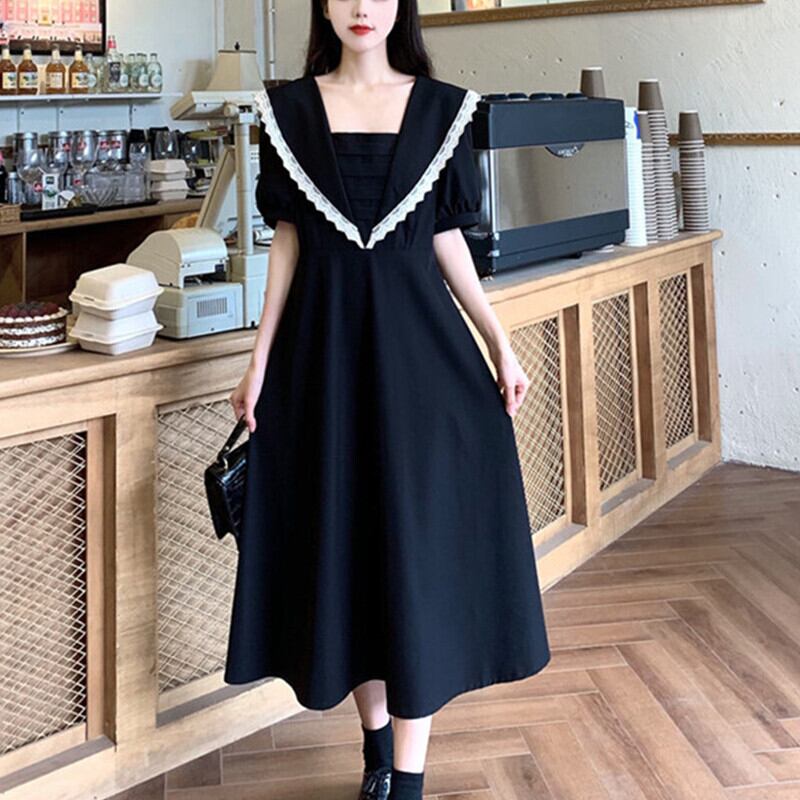 ワンピース レディース ロング丈 ブラック レースステッチ 半袖 夏 レトロ ドーリー ゆったり 大きいサイズ デート お出かけ MH3087