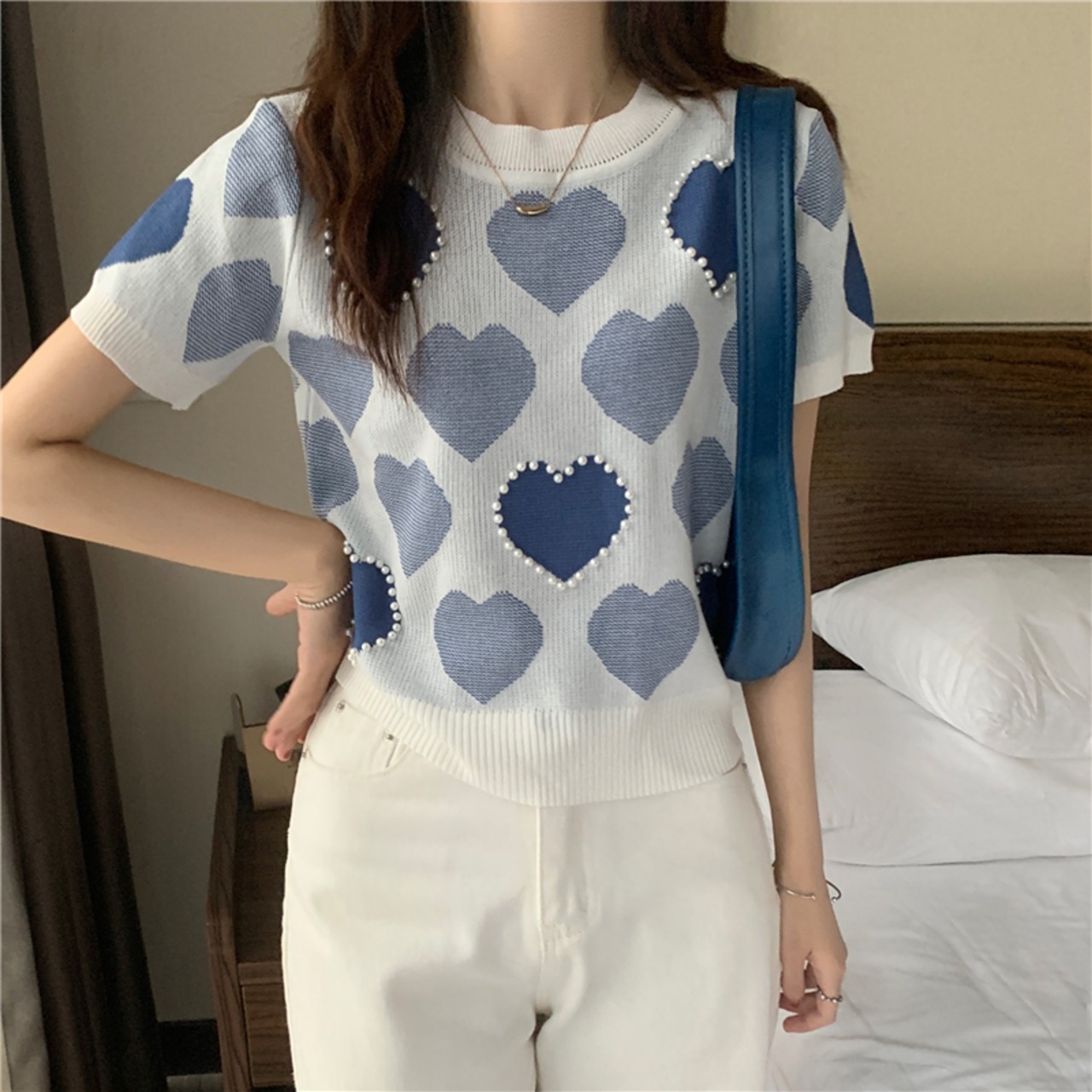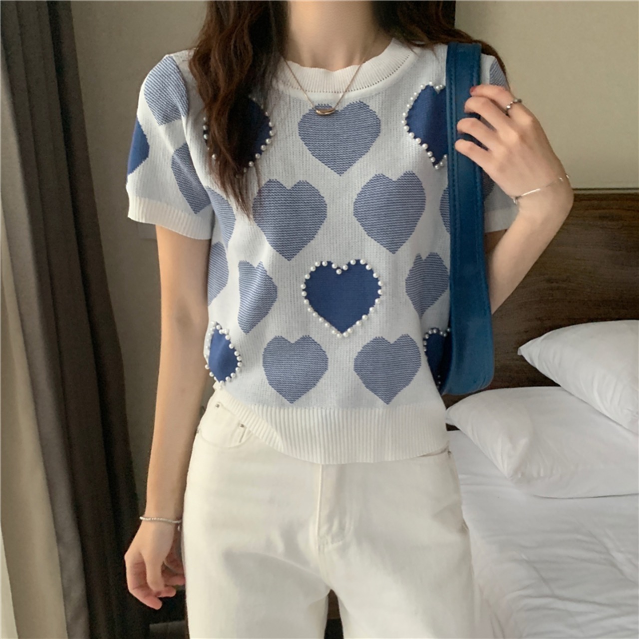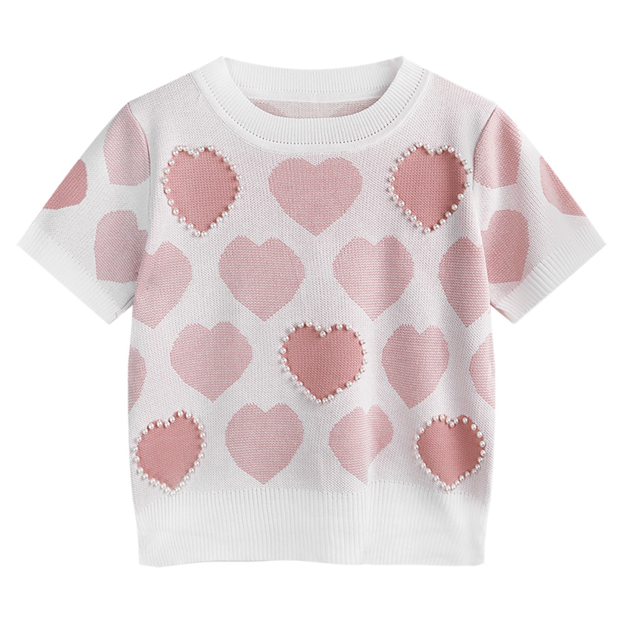 ニット トップス レディース 半袖 ハート柄 ラブリー ビジュー ガーリー カジュアル ママコーデ デート お出かけ MH3089